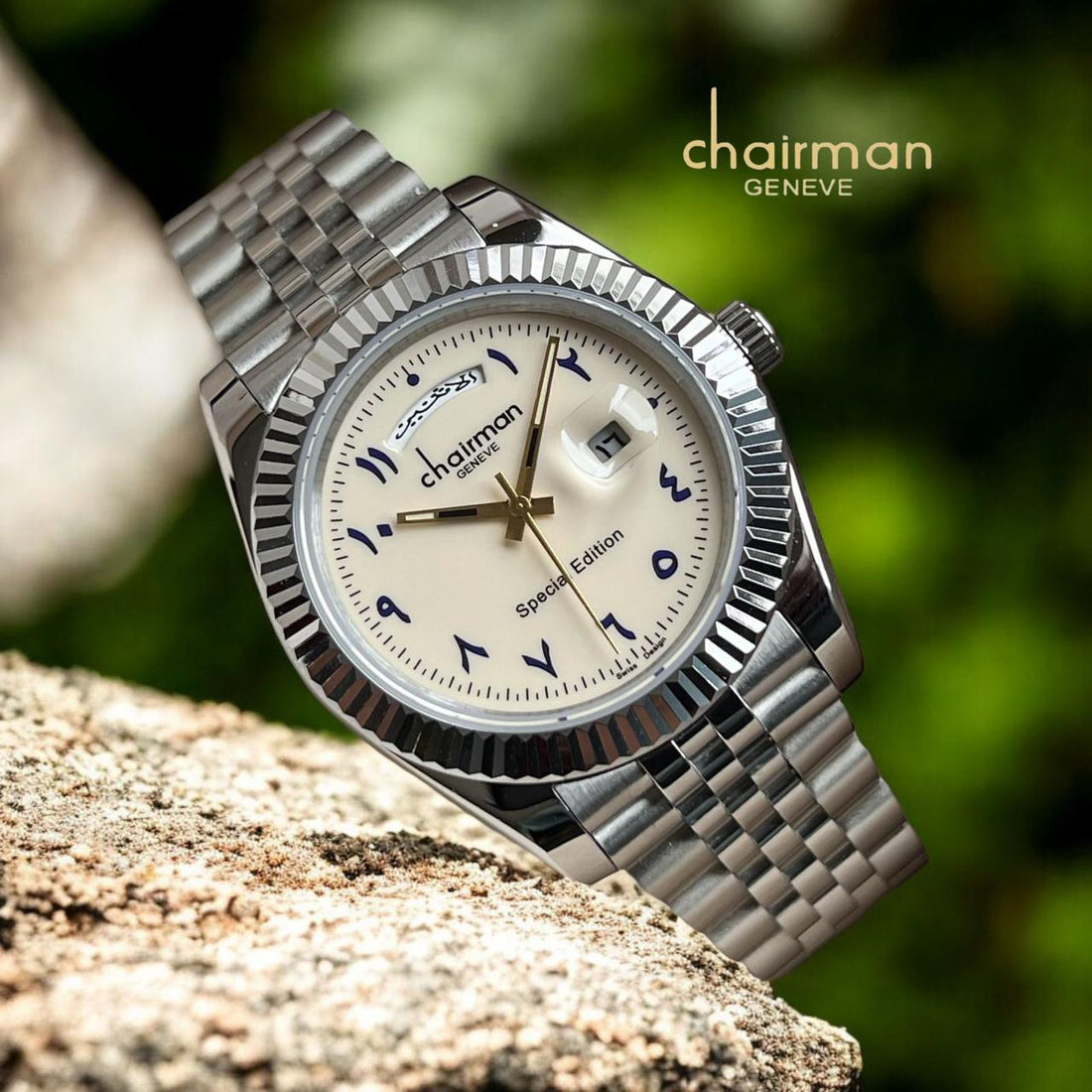 Chairman Geneve Day And Dated Arabic Off White Dial Silver Chain Gents Watch