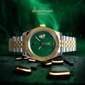 Elevate your style with the Chairman Geneve OMAN Emblem Gents Watch, featuring a striking green dial and a distinctive dated display. Crafted with a refined silver and gold chain, this timepiece combines elegance and durability. Perfect for the modern gentleman, it adds a sophisticated touch to any outfit while proudly showcasing the OMAN emblem. This watch is a statement of timeless class and cultural pride.