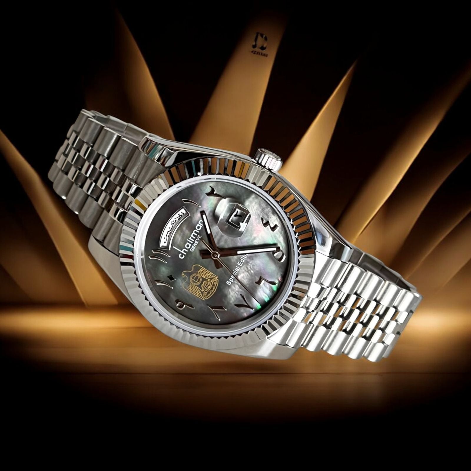Experience elegance with the Chairman Geneve UAE Emblem Gents Watch, featuring a striking grey dial adorned with Arabic numerals. Its day and date display keeps you informed at a glance, while the silver chain strap offers a timeless, sophisticated look. This watch perfectly blends cultural pride with refined design, making it an ideal accessory for the modern gentleman.