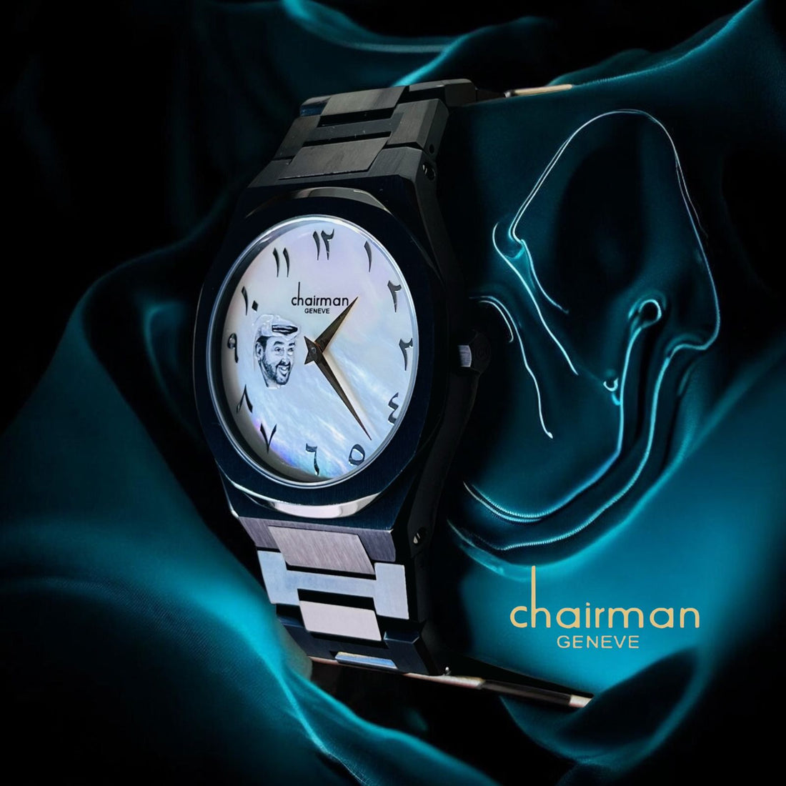 Chairman Geneve ABU DHABI Emblem Arabic Dated White Dial Silver Chain Gents Watch