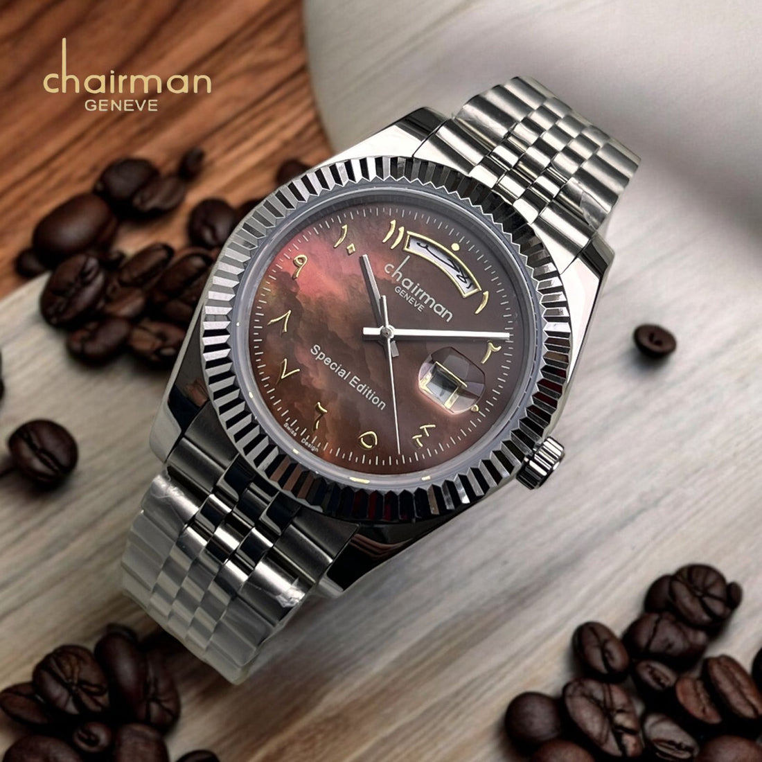 نقدم لك الإصدار الخاص من ساعة Chairman بمينا عربية وسلسلة فضية بيضاء لؤلؤية. ارتقِ بأسلوبك...