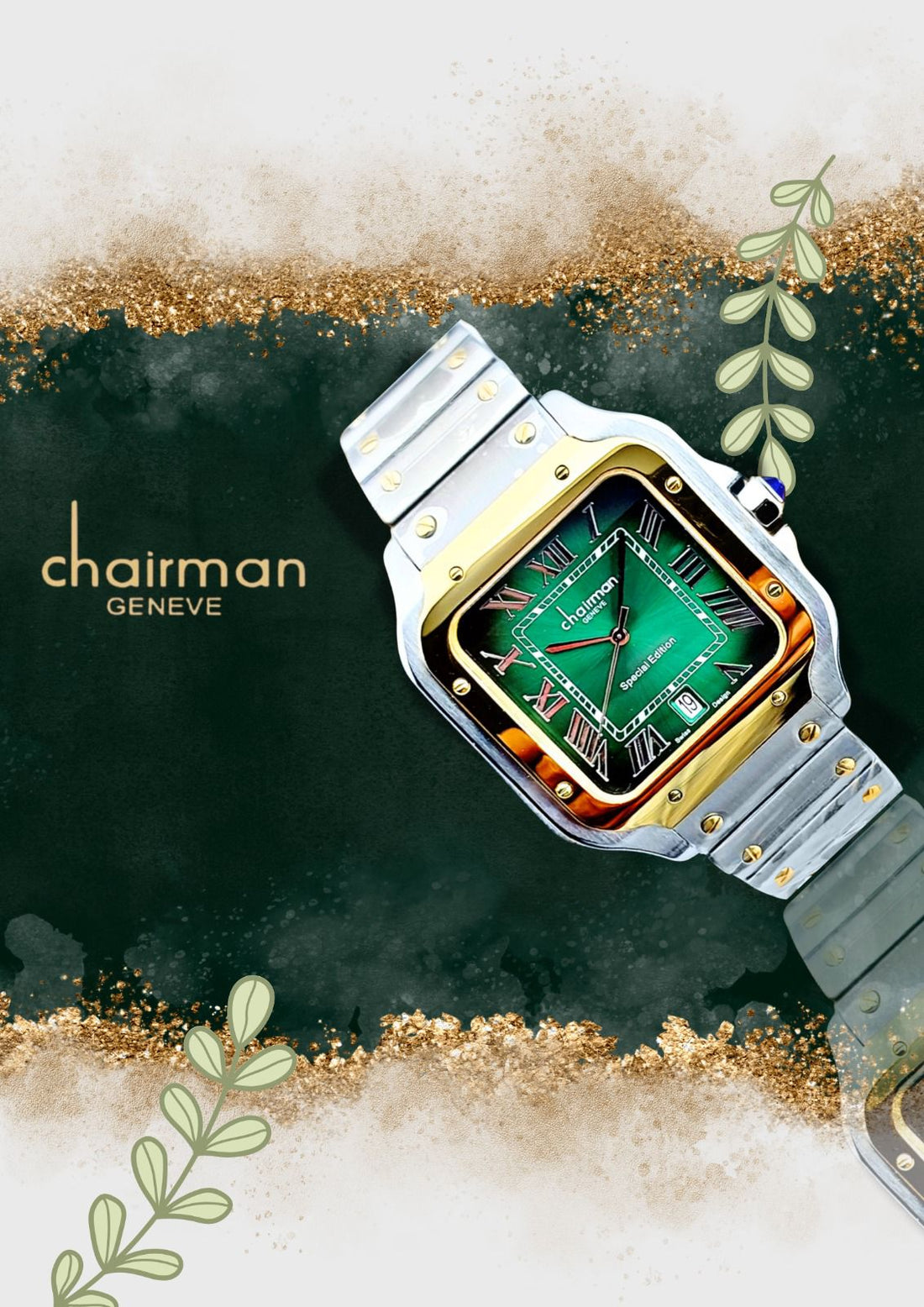 ارتقِ بأسلوبك مع ساعة Chairman Geneve ذات المينا المربعة الخضراء والسوار الفضي الذهبي التي تحمل...