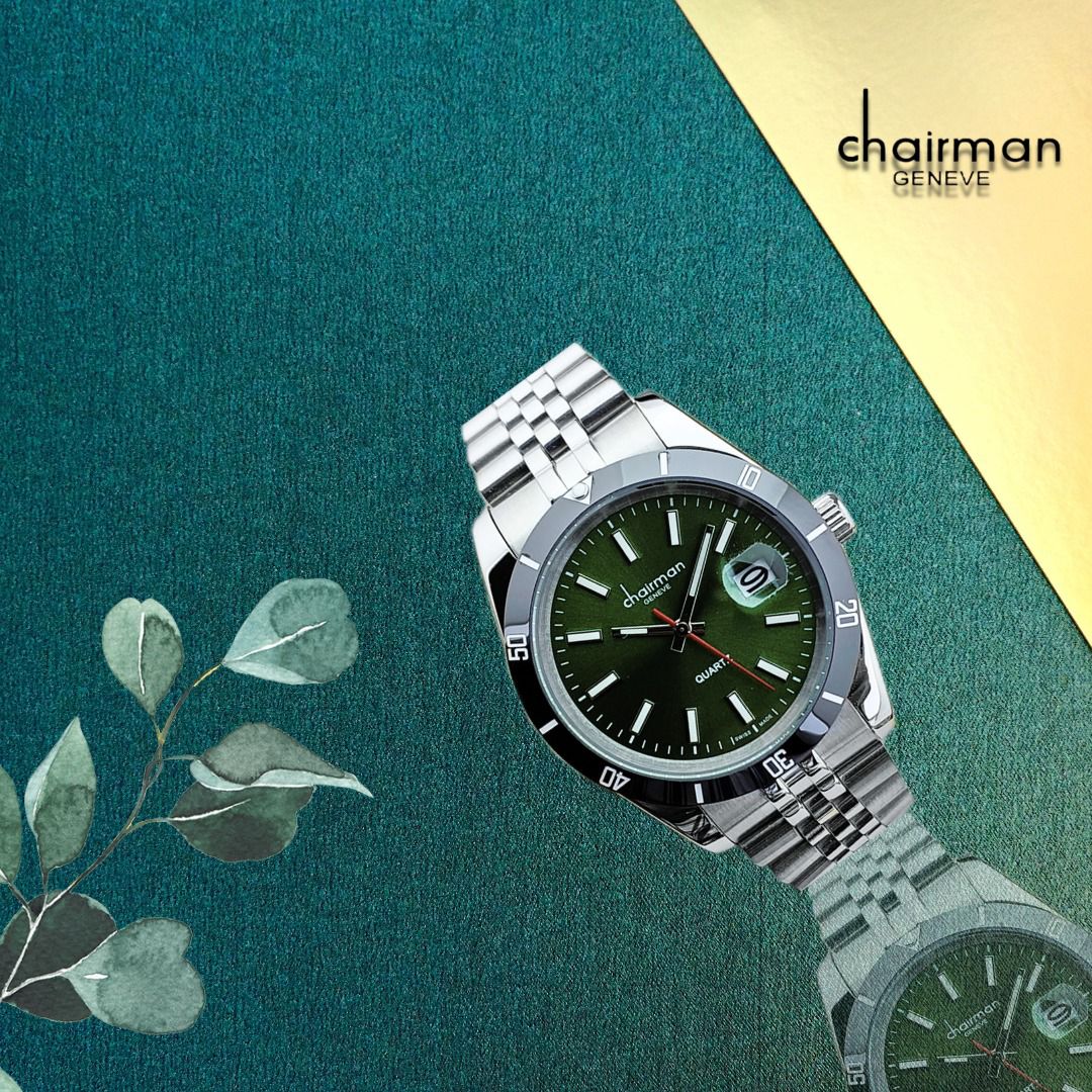 ساعة رجالية سويسرية الصنع باللون الأخضر الداكن من Chairman Geneve بحزام فضي