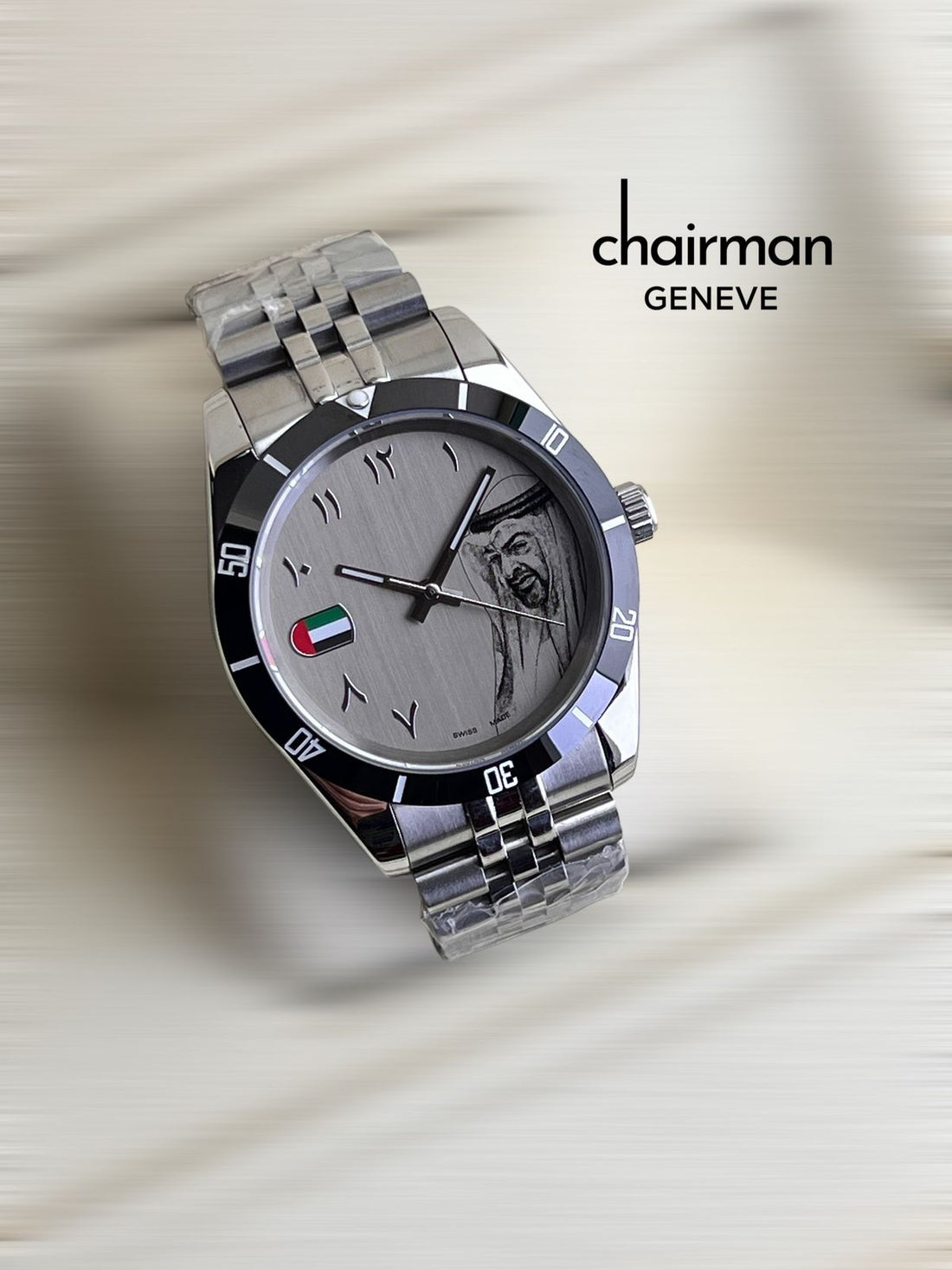ساعة Chairman Geneve Swiss Made بمينا عربية وسوار فضي بعلم الإمارات العربية المتحدة