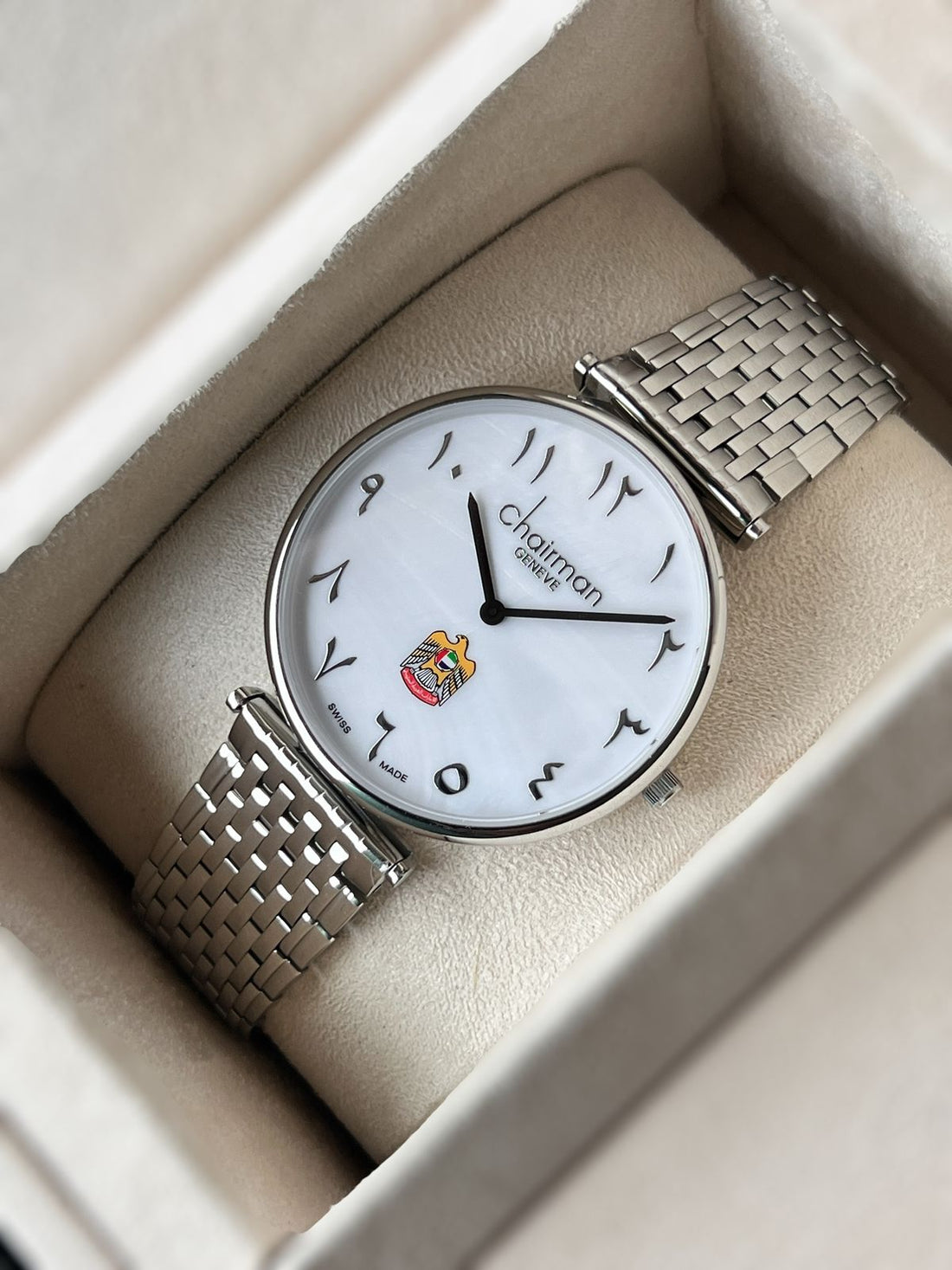 UAE Emblem Chairman Geneve Arabic White Dial Silver Chain Gents Watch