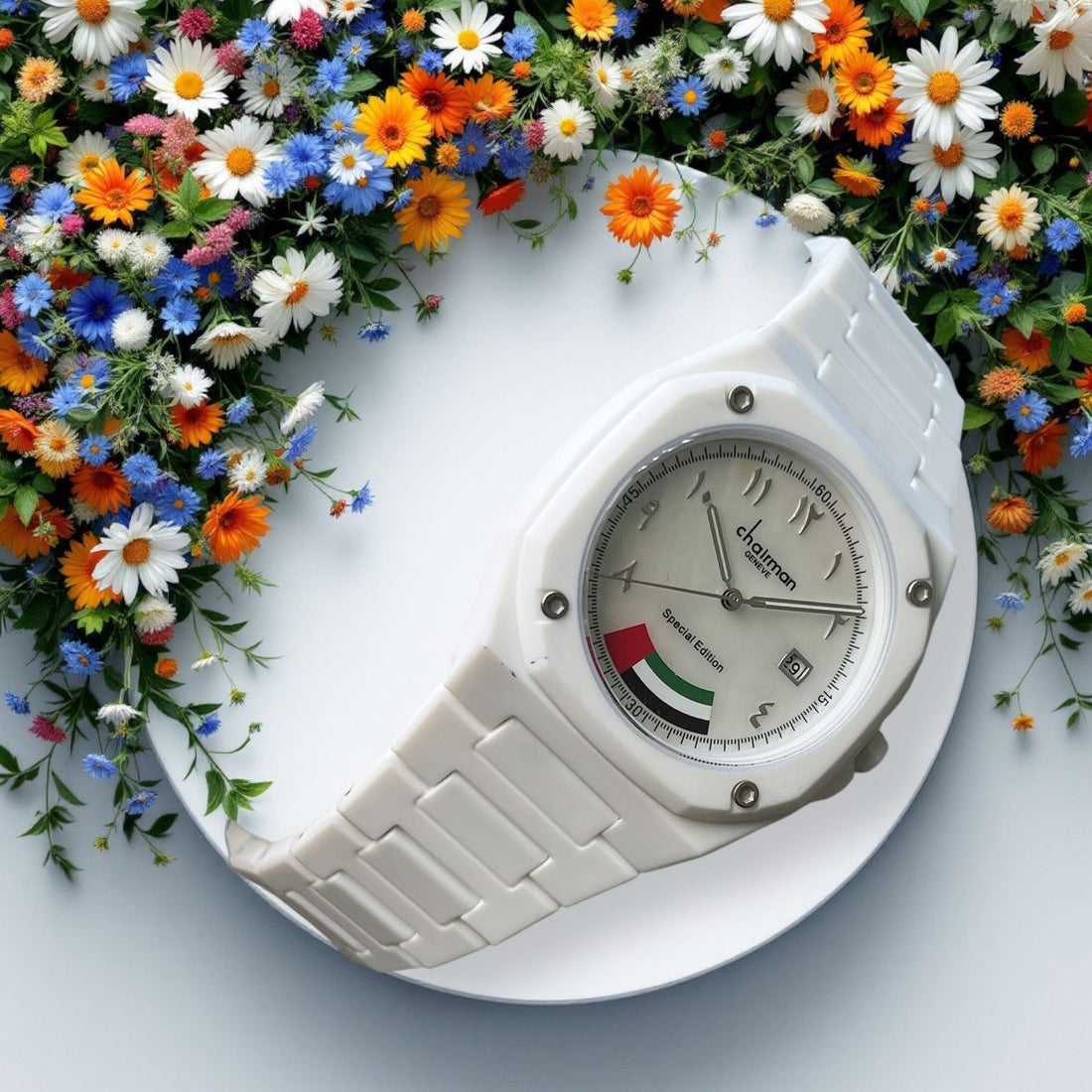 Elevate your style with the Chairman Geneve UAE Flag Arabic Dated Dial White Poly Carbon...