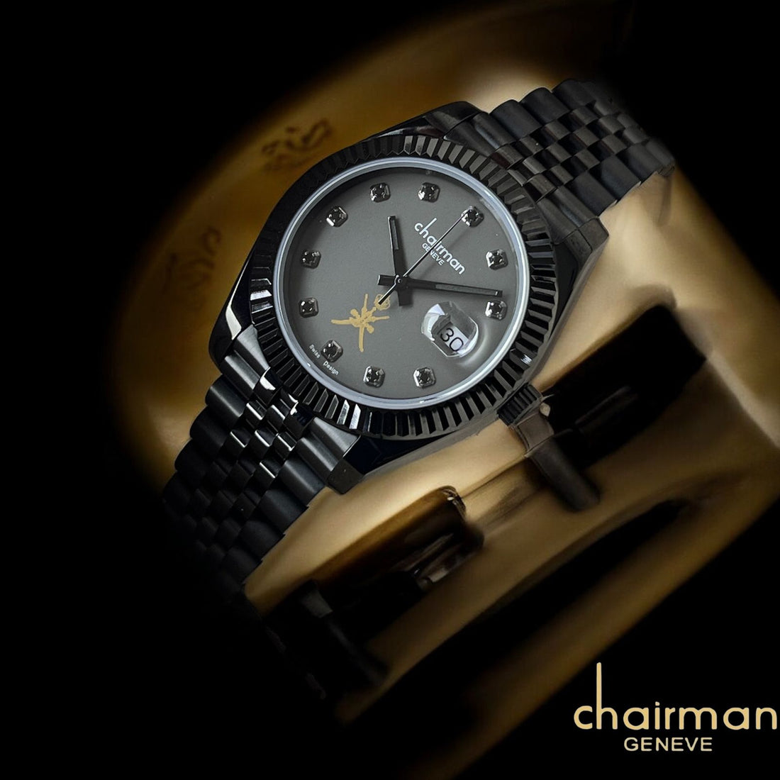 OMAN Emblem Chairman Geneve Dated Black Dial Black Chain Gents Watch