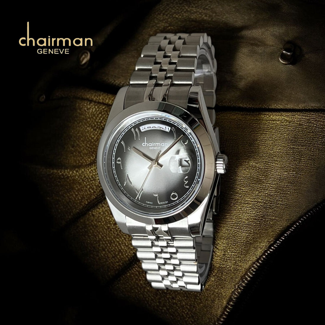 Chairman Geneve OMAN Emblem Arabic Day And Dated Baby Grey Silver Chain Gents Watch
