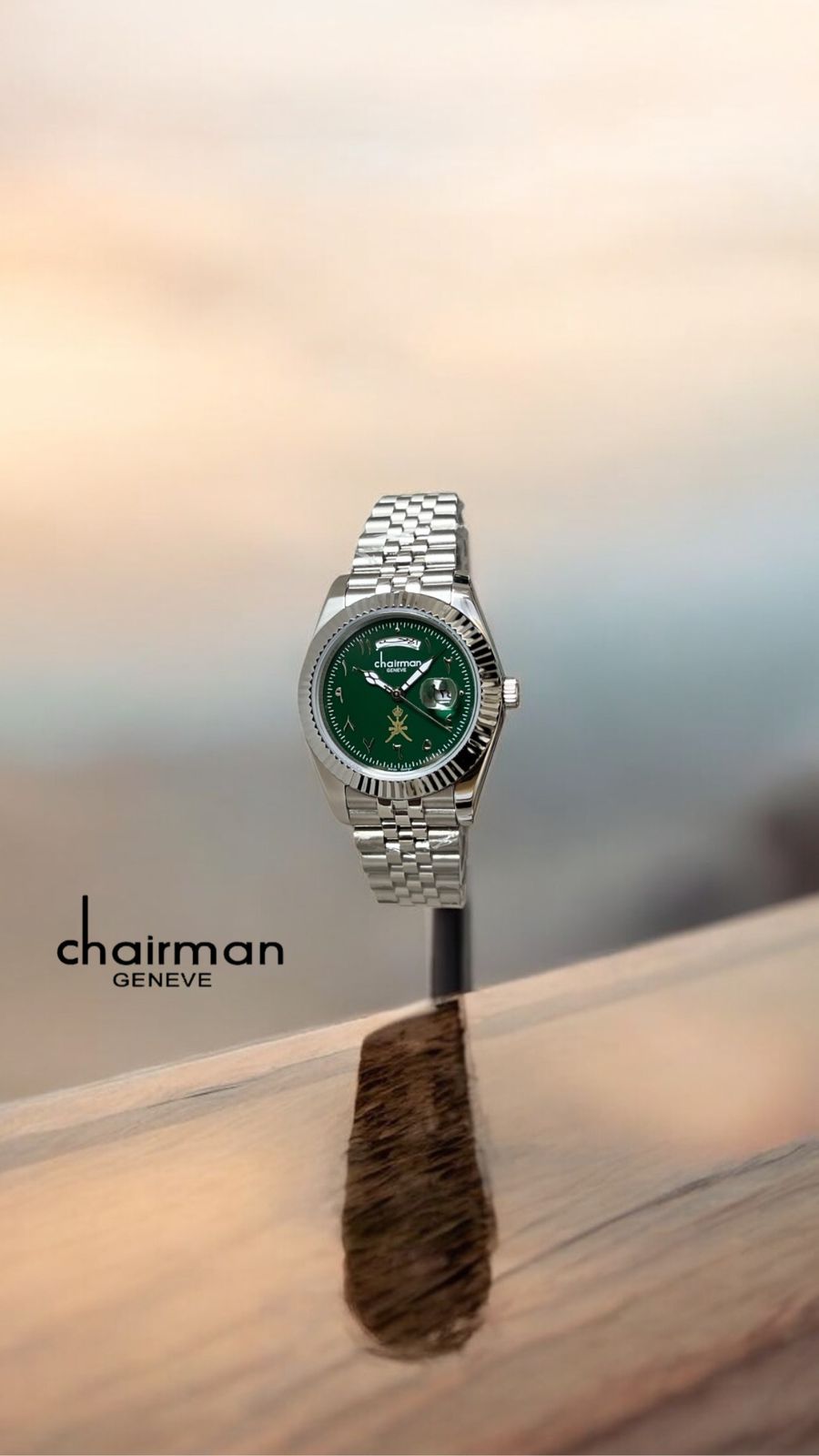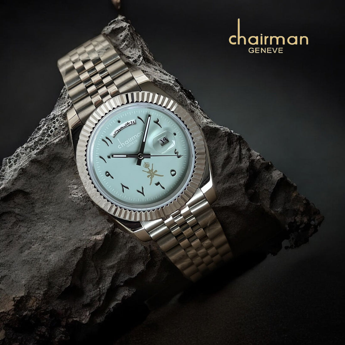Chairman Geneve Day And Dated OMAN Emblem Green Dial Silver Chain Gents Watch