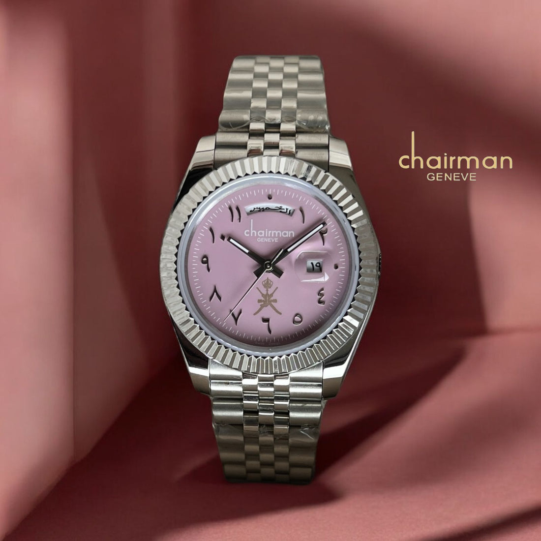 Chairman Geneve OMAN Emblem Arabic Day And Dated Pink Dial Silver Chain Gents Watch