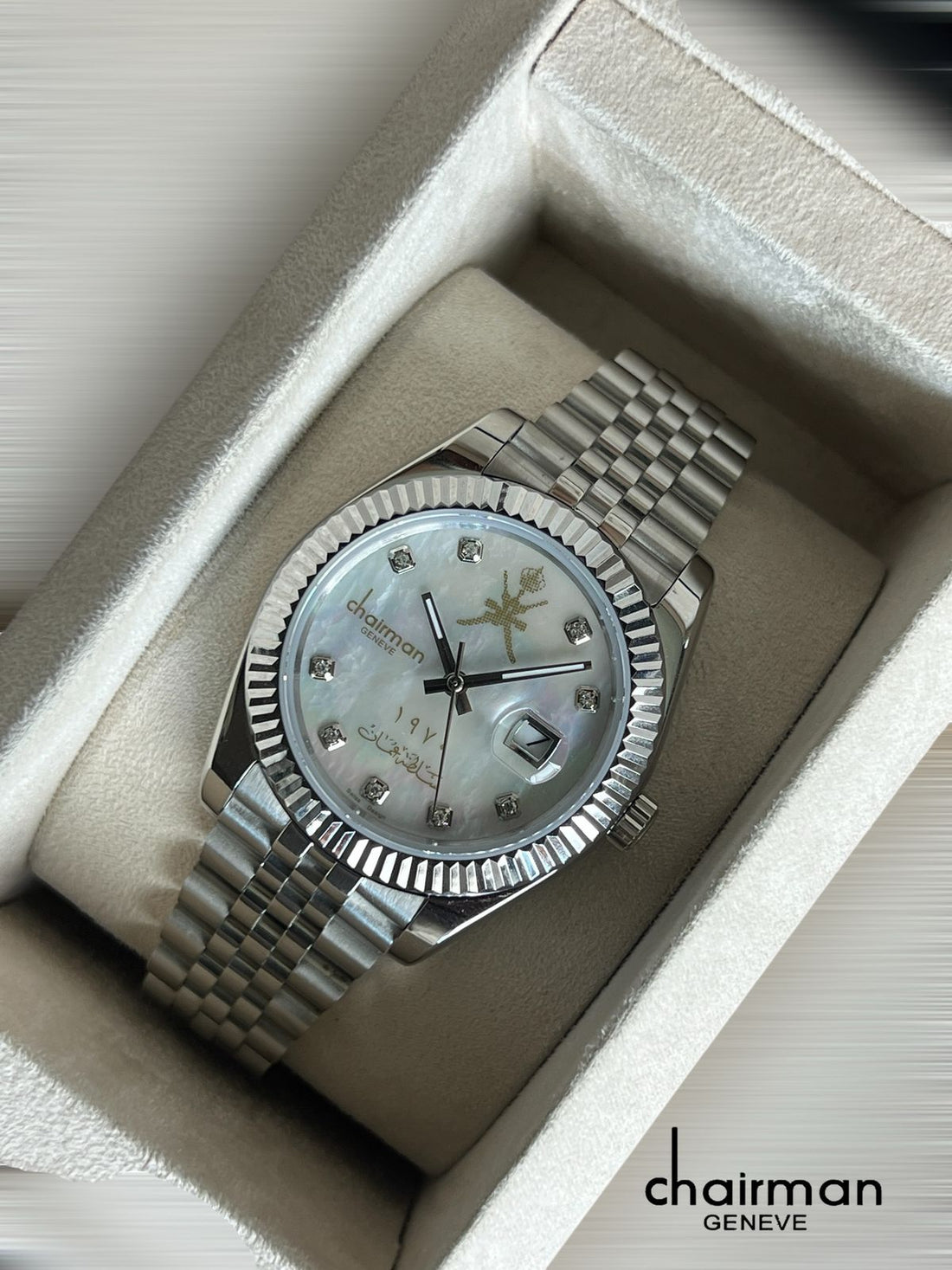 Elevate your style with our White Marble Dial Dated Chairman Geneve Silver Chain Gents Watch....