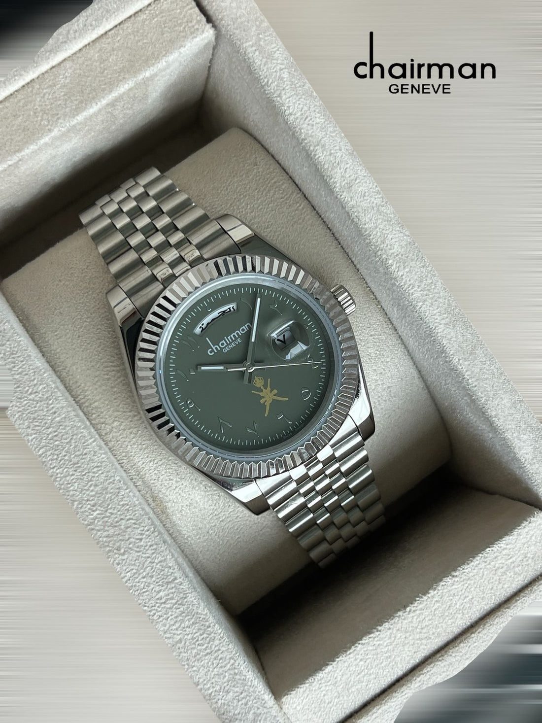 Roman Green Dated Dial Chairman Geneve Silver Chain Gents Watch