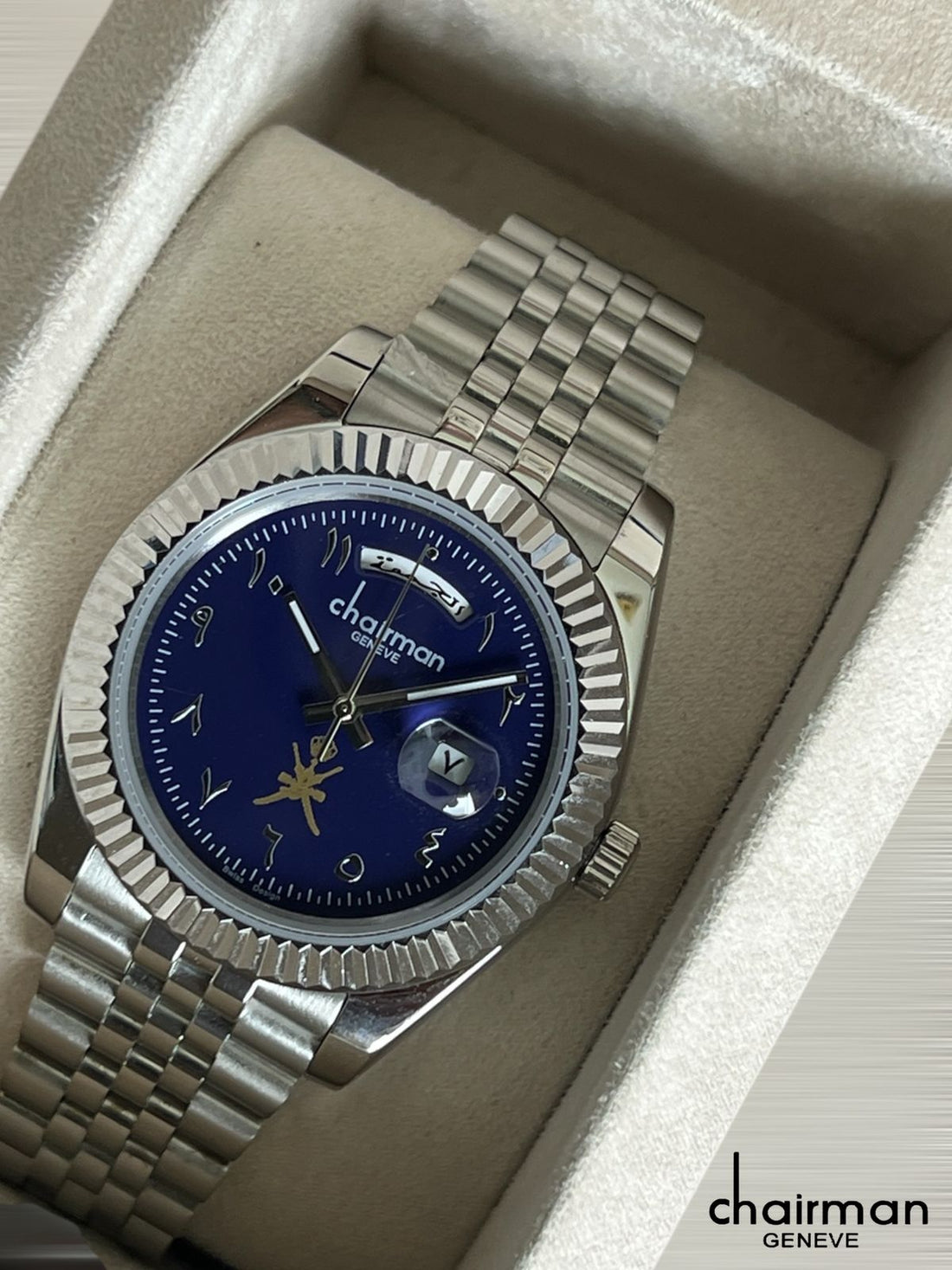 Blue Dated Arabic Dial Chairman Geneve Silver Chain Gents Watch