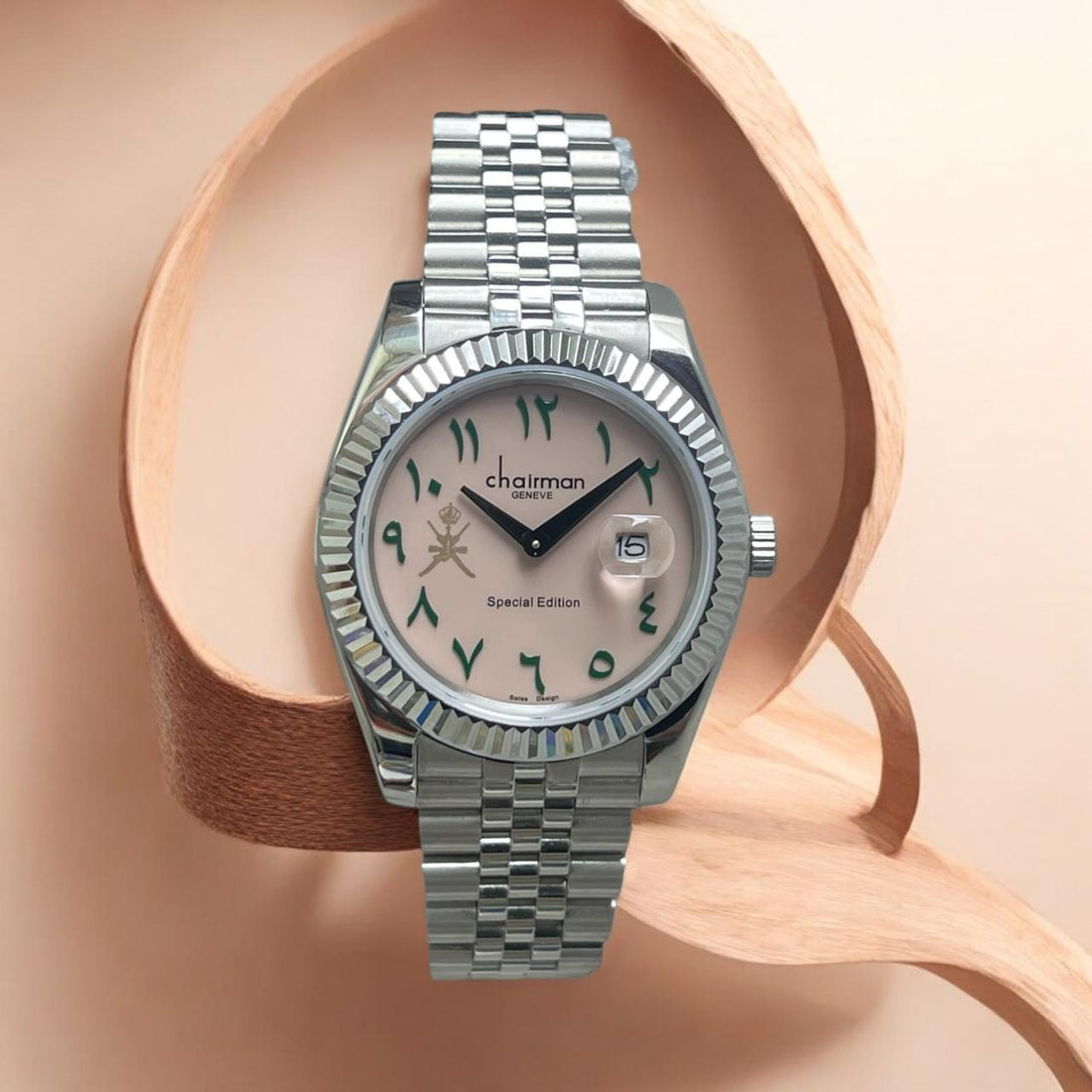 ساعة Chairman Geneve عربية ذات مينا وردية وسلسلة فضية للرجال بإصدار خاص