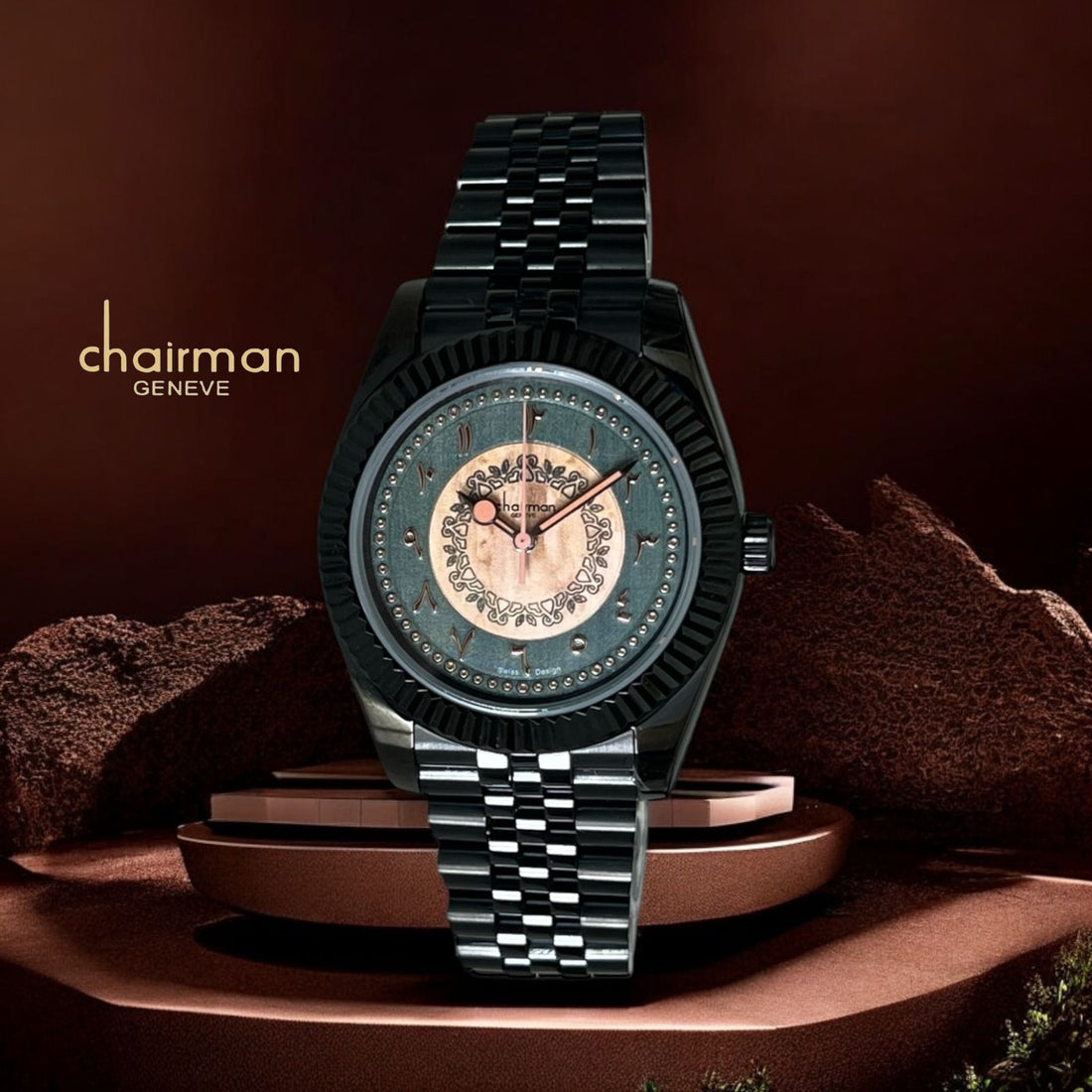 نقدم لكم ساعة Chairman Geneve Arabic Green And Beige Dial Black Chain للرجال - مصممة...
