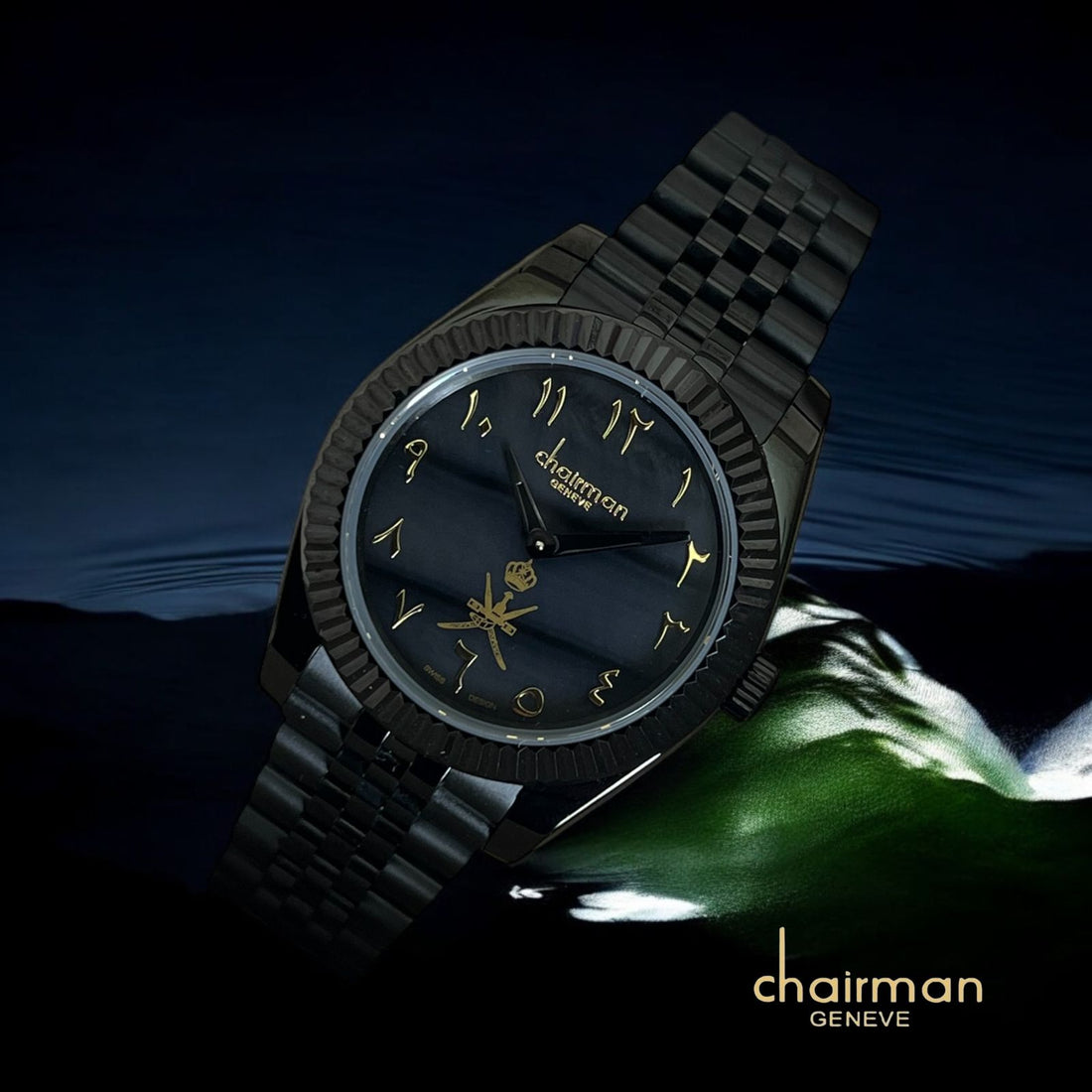 ساعة Chairman Geneve عربية للرجال بمينا سوداء وسلسلة سوداء