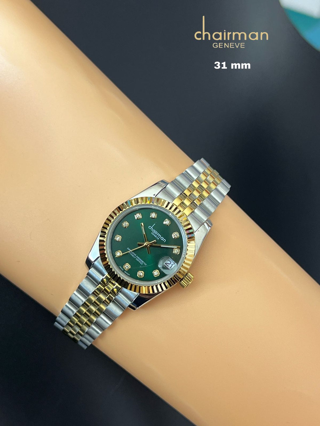ارتقِ بأسلوبك مع ساعة Chairman Geneve Green Stone Dated Dial Silver Gold Chain للرجال. تتميز...