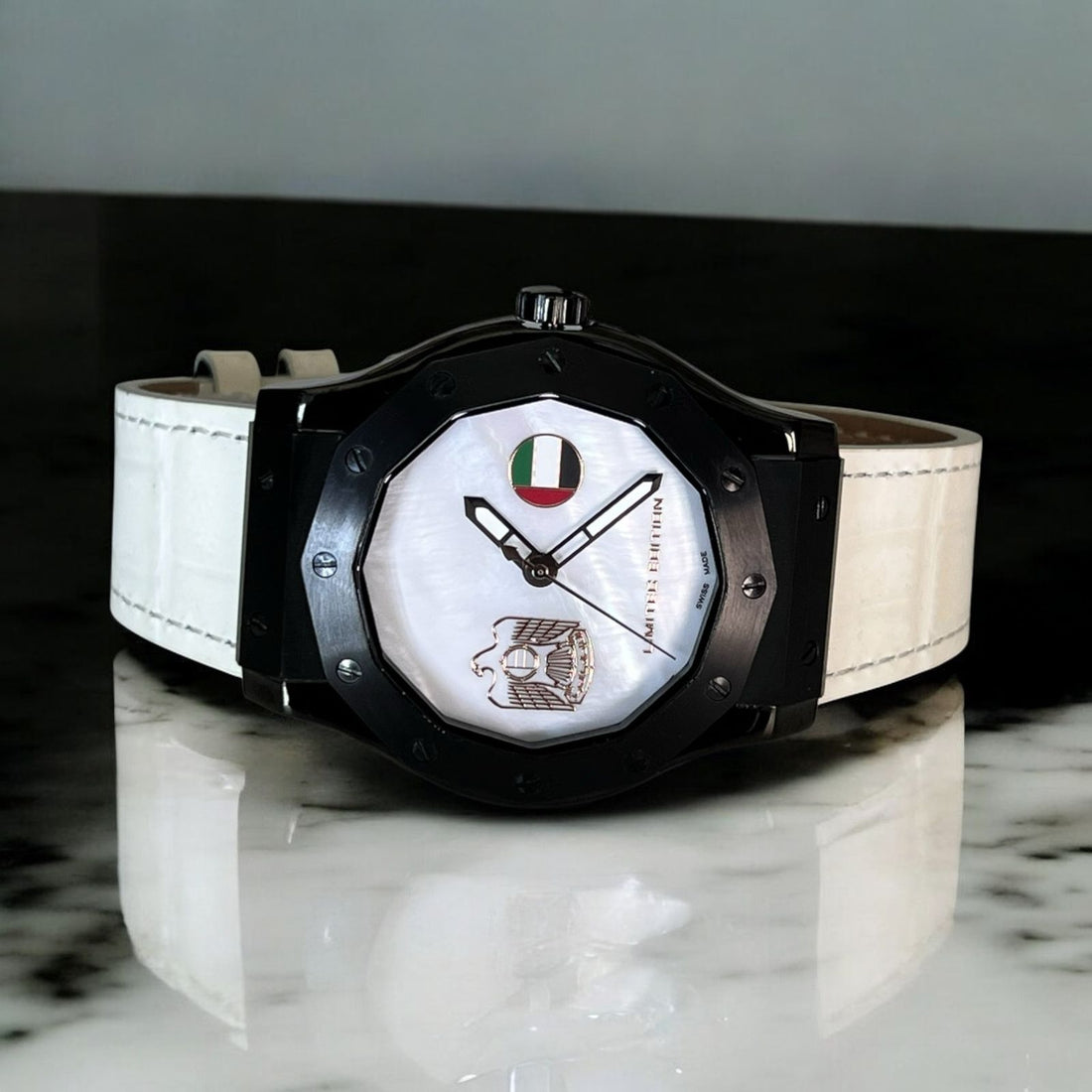 Experience timeless elegance with the Mirror Dial Chairman Geneve watch, featuring a distinctive UAE emblem...