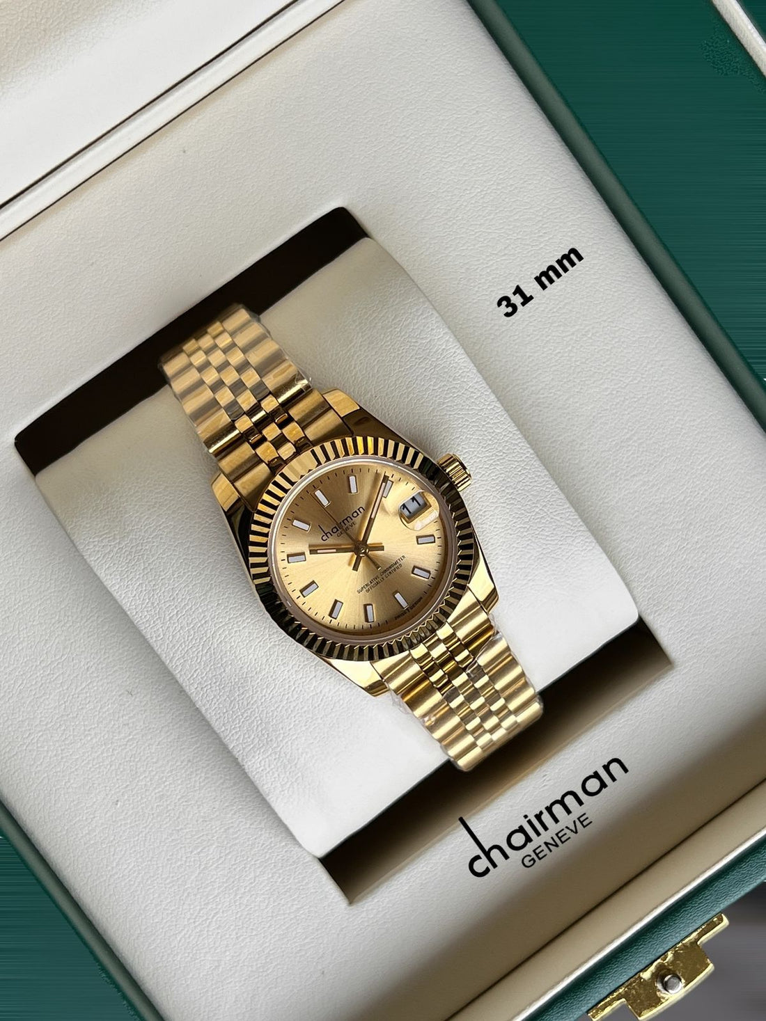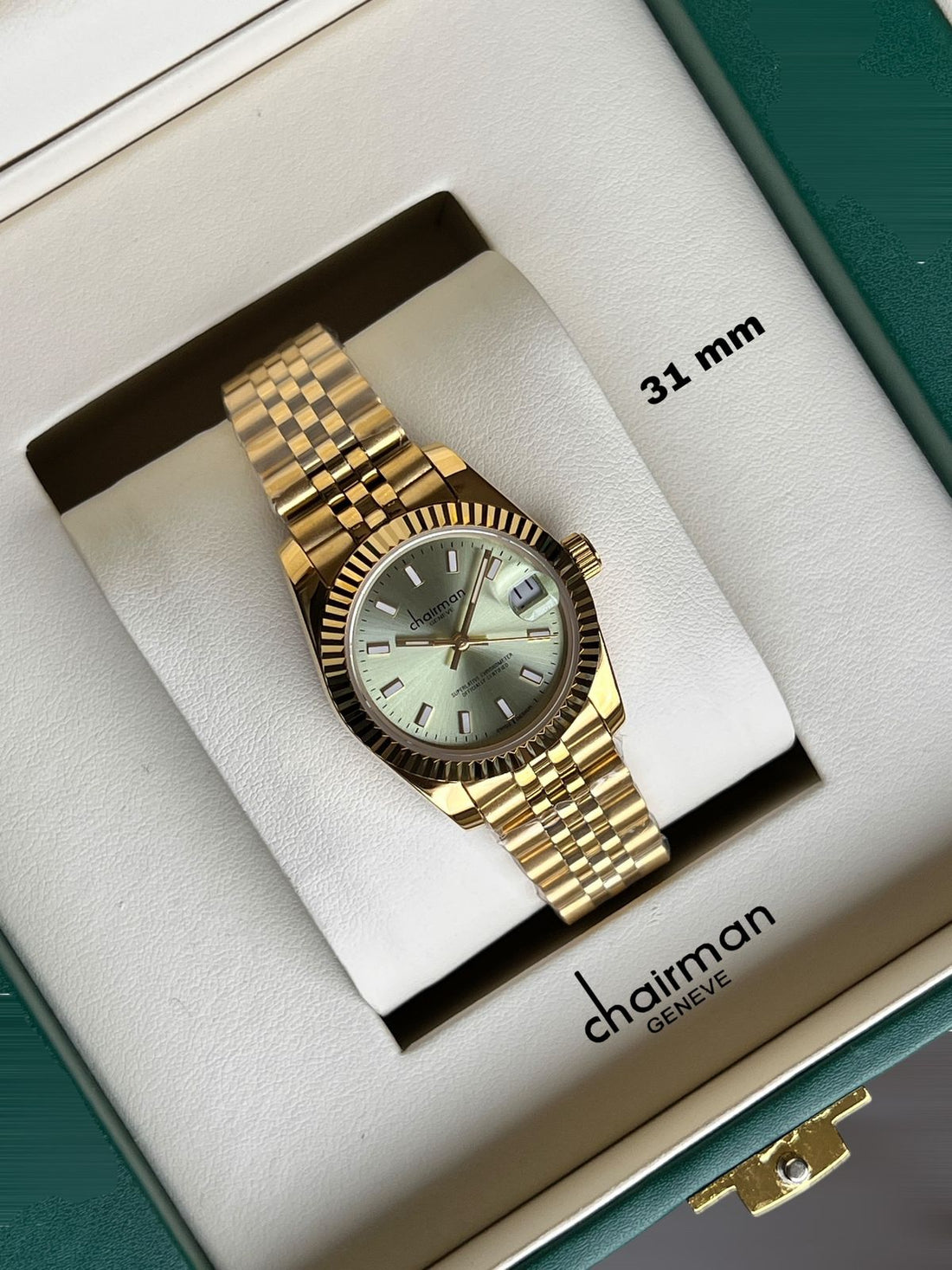 Chairman Geneve Baby Green Dated Dial Golden Chain Ladies Watch
