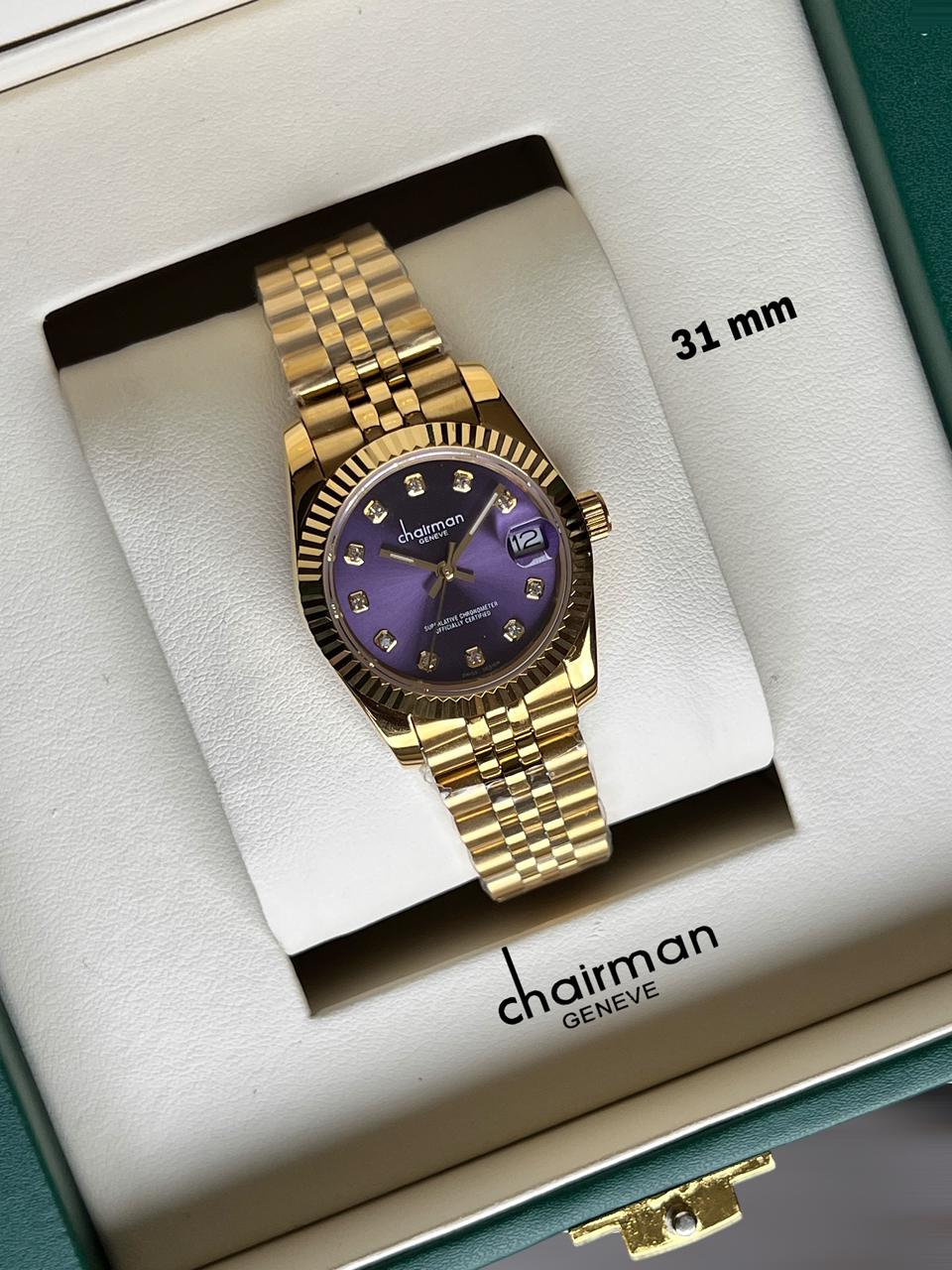 Chairman Geneve Dated Purple Dial Golden Chain Ladies Watch