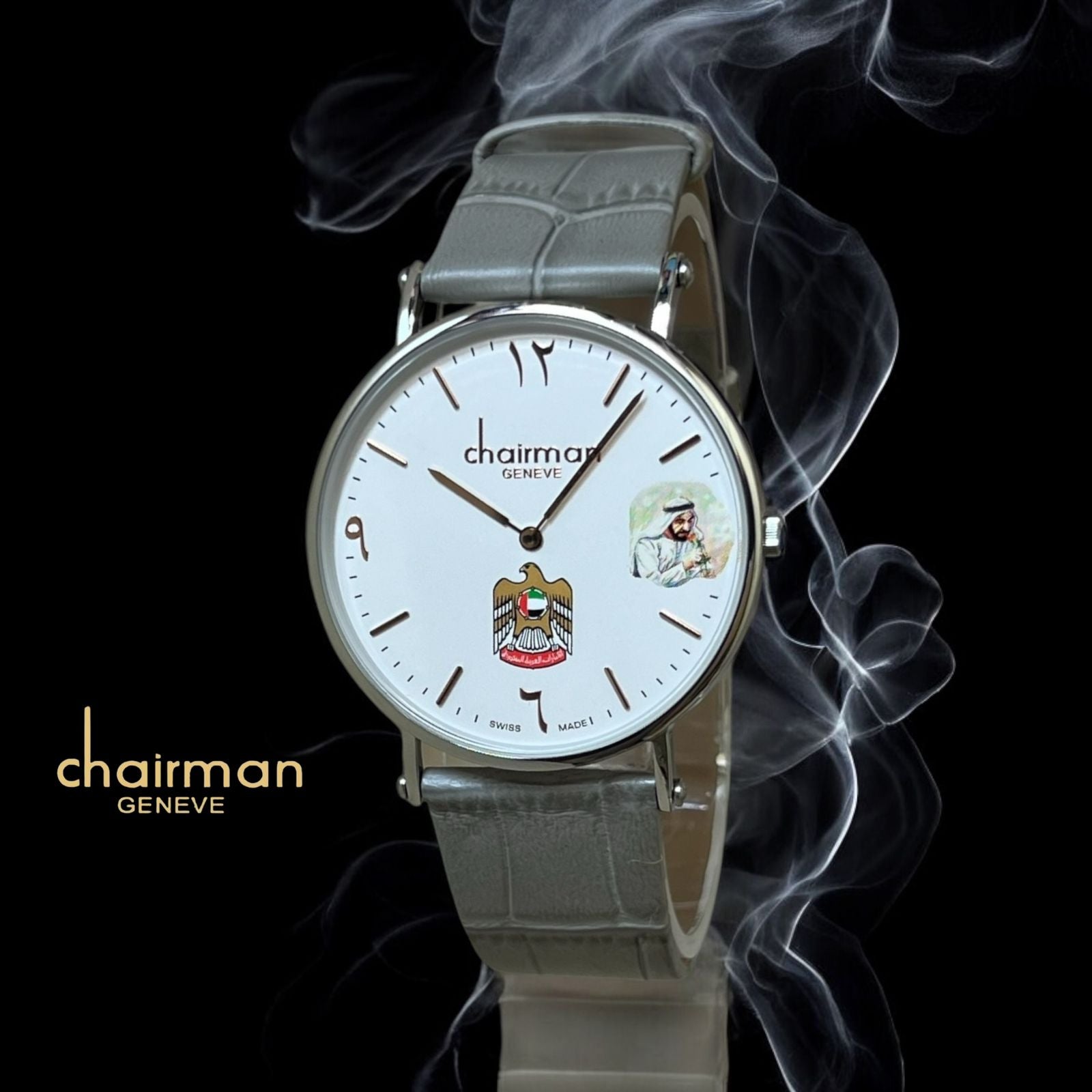 أظهر فخرك بأبوظبي من خلال ساعة Chairman Geneve المصنوعة في سويسرا. تتميز هذه الساعة الأنيقة بمينا عربية جميلة وحزام رمادي لجماليات متطورة. لا تفوت أي اجتماع أو مناسبة بدقة وأناقة.