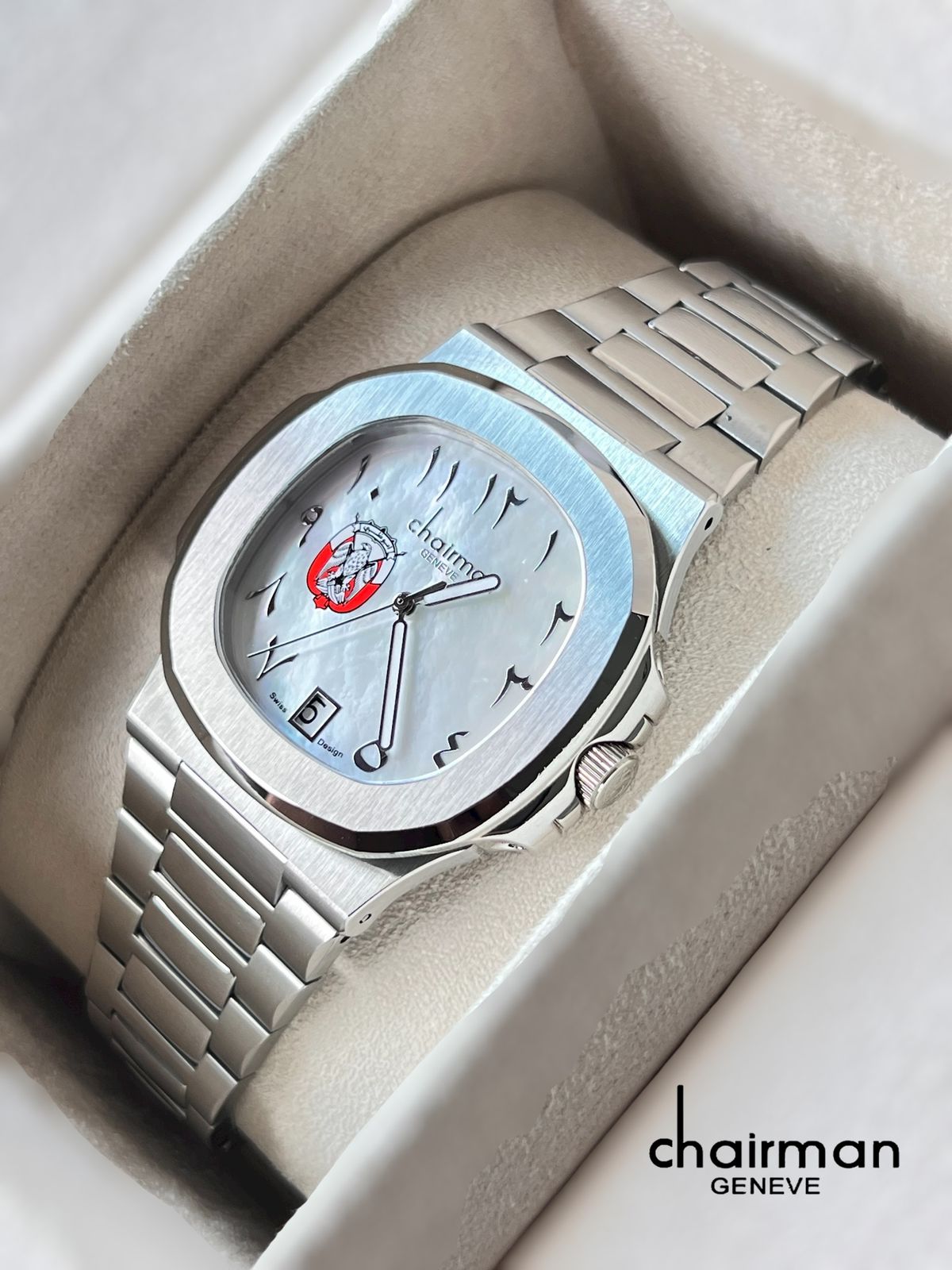 Chairman Geneve ABU DHABI Emblem Dated Arabic White Dial Silver Chain Gents Watch
