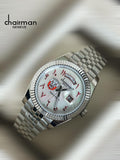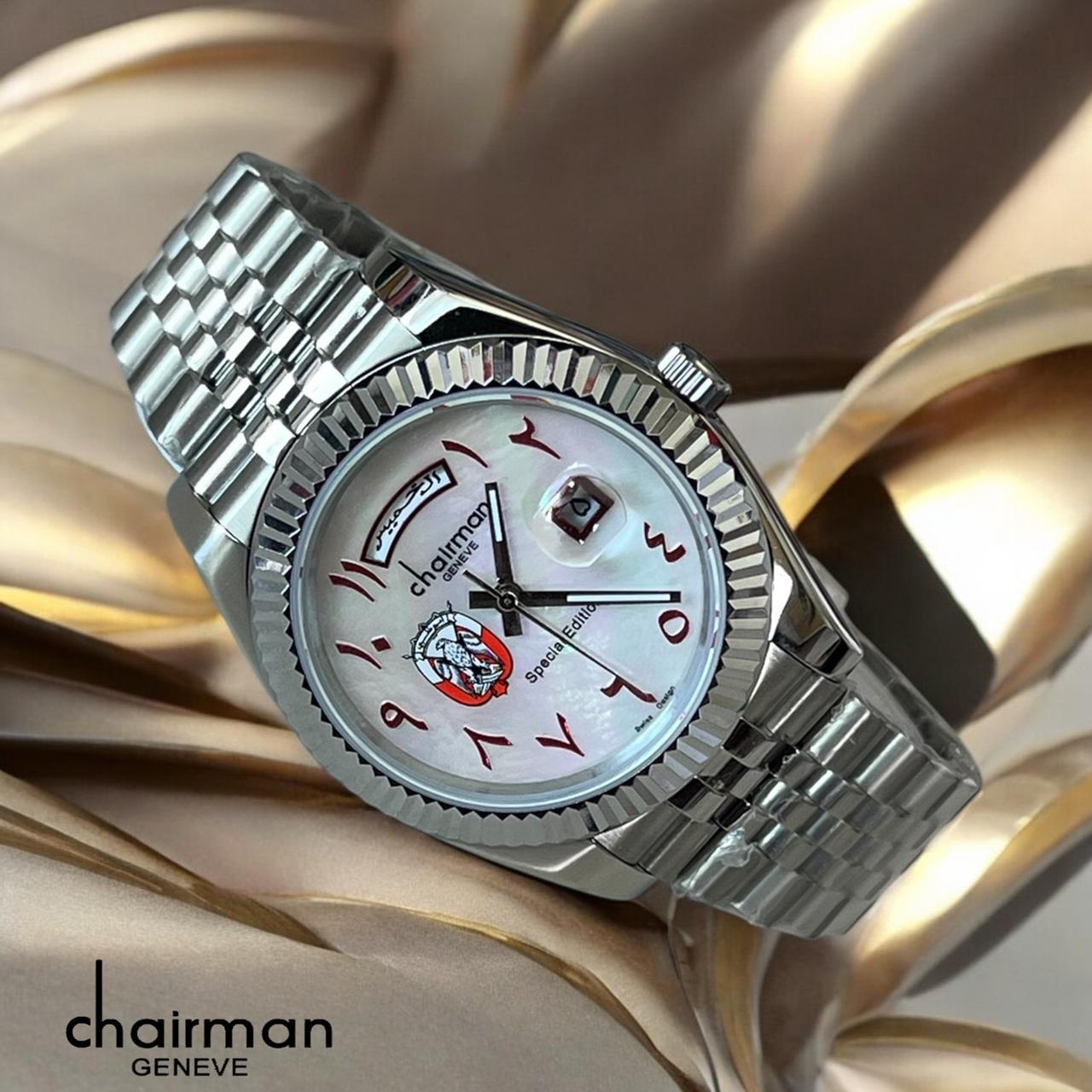 ادخل إلى عالم الفخامة مع ساعة Chairman Geneve Arabic Dial Dated Silver Strap للرجال. تضيف المينا العربية الفضية وميزة التاريخ لمسة من الرقي إلى خزانة ملابسك. واكب جدولك الزمني المزدحم وتميز عن الآخرين بهذه الساعة المذهلة.