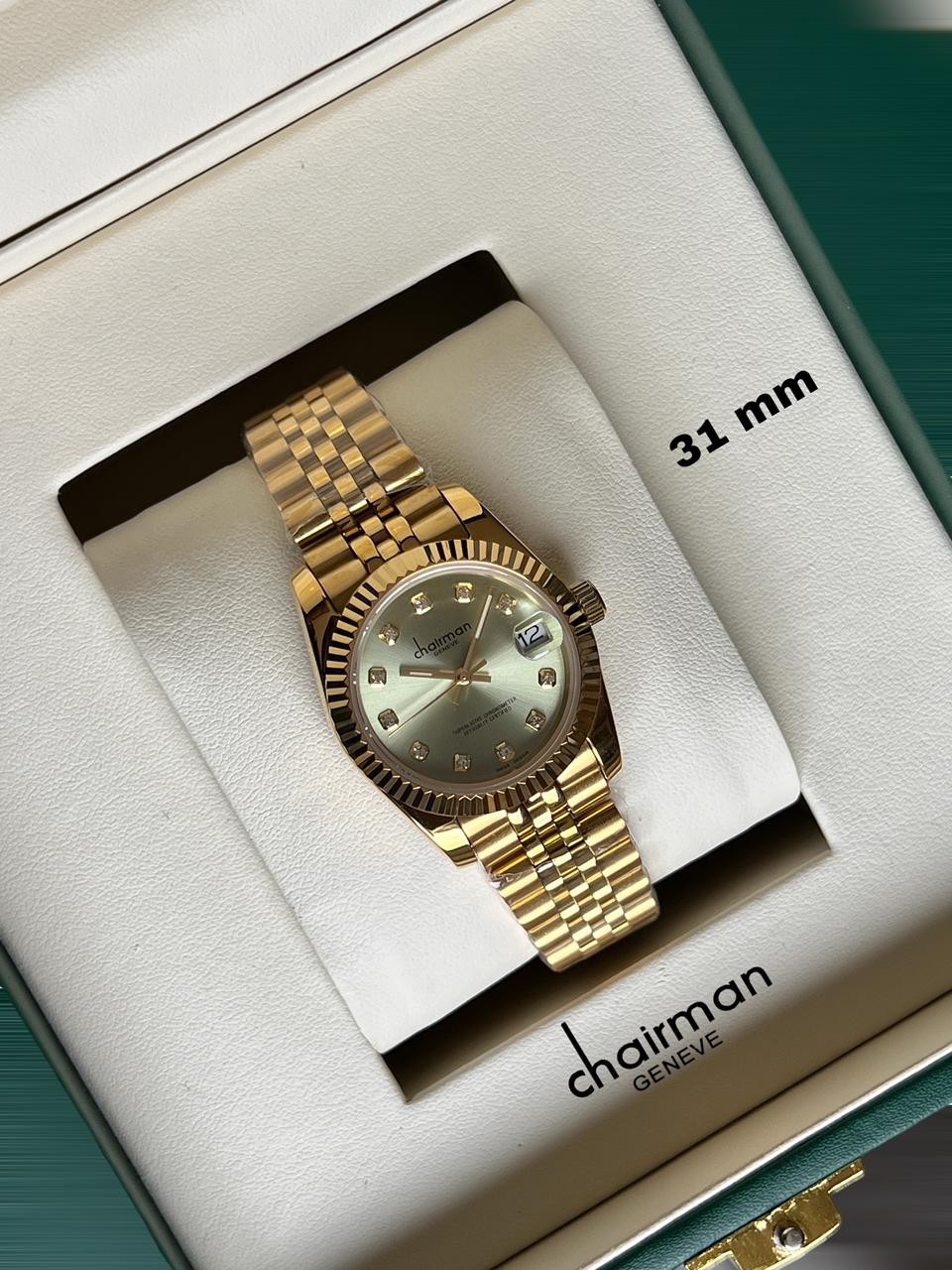 Introducing the elegant and timeless Chairman Geneve Baby Green Dated Stone Dial Golden Chain Ladies Watch. Featuring a luxurious golden chain and a striking green stone dial, this watch is a statement piece that adds a touch of sophistication to any outfit. A must-have for any fashion-forward woman.