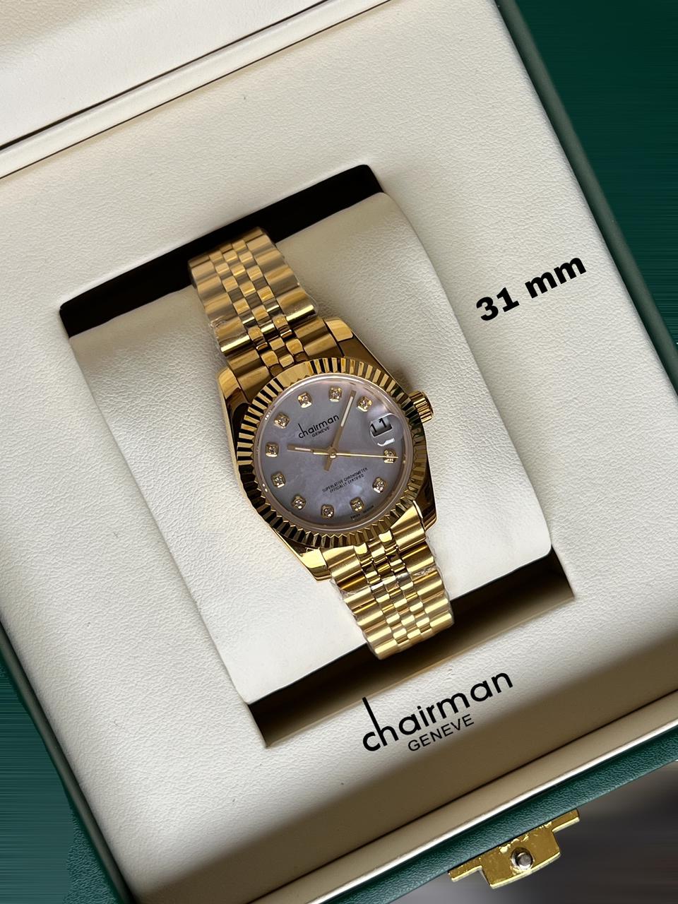 Introducing the Chairman Geneve Baby Grey Dated Stone Dial Golden Chain Ladies Watch. This elegant watch features a unique grey stone dial and a golden chain that adds a touch of luxury to any outfit. Stay on time and in style with this must-have accessory.