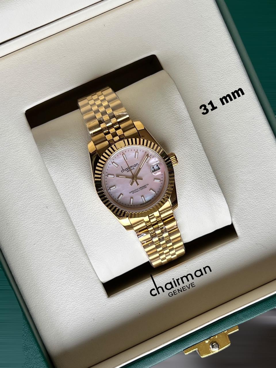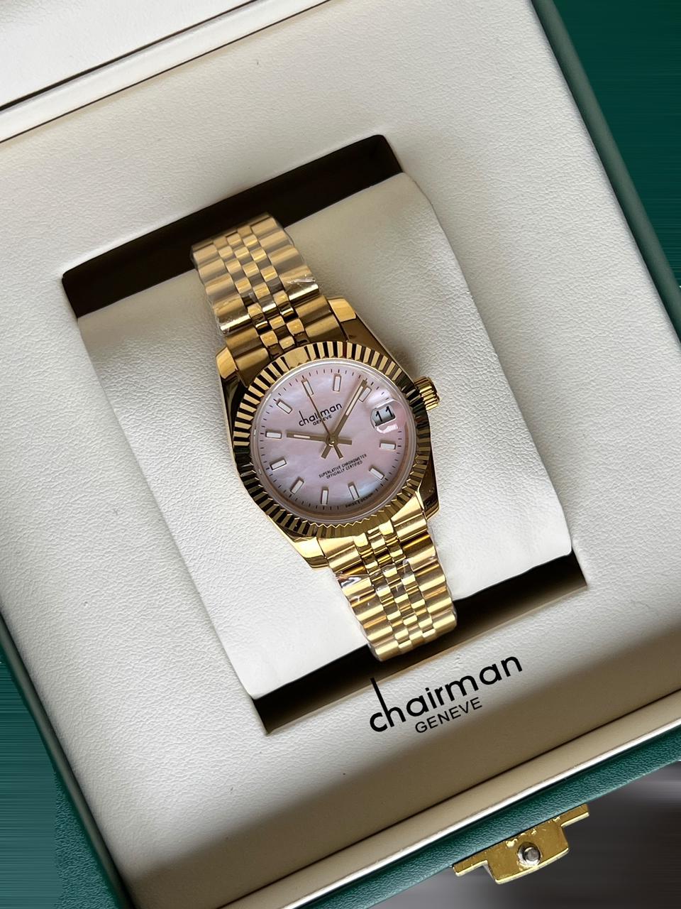 Elevate your style with the Chairman Geneve Baby Pink Dated Dial Golden Chain Ladies Watch. This elegant timepiece features a beautiful baby pink dial with a convenient date display, complemented by a chic golden chain for a touch of sophistication. Stay fashionable and on time with this stunning watch.