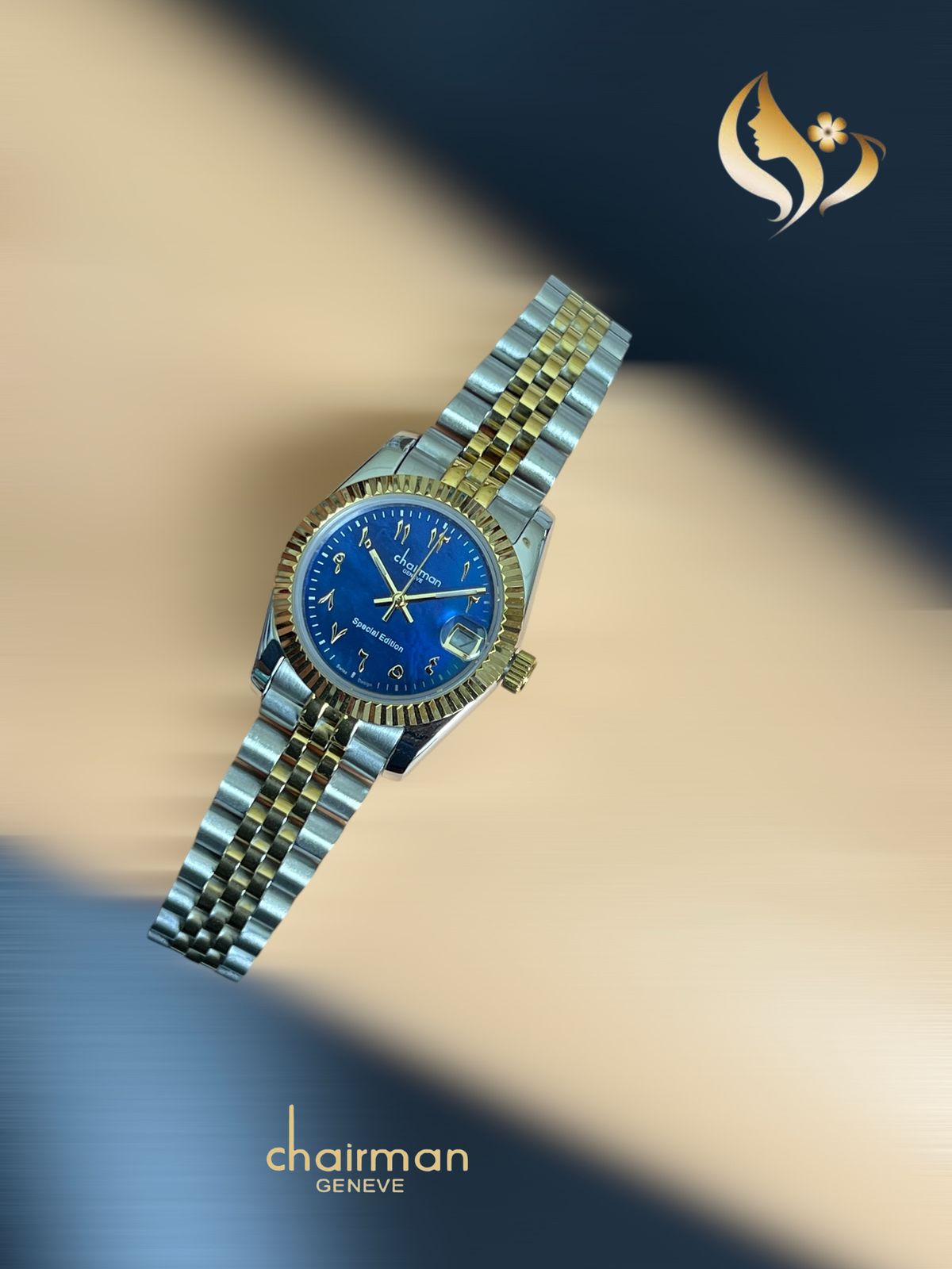 Introducing the Chairman Geneve ladies watch, featuring a stunning silver and gold chain and a classic blue Arabic dated dial. With this timepiece, you'll make a bold statement and always stay on schedule.