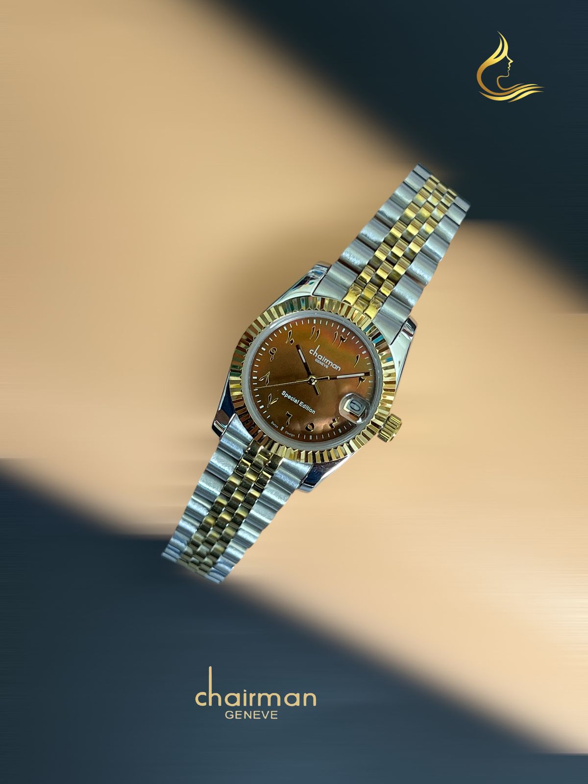 Experience luxury and elegance with our Chairman Geneve Brown Arabic Dated Dial Silver And Gold Chain Ladies Watch. The classic Arabic numbers and exquisite silver and gold chain add the perfect touch of sophistication. Stay punctual and stylish with this timeless timepiece.