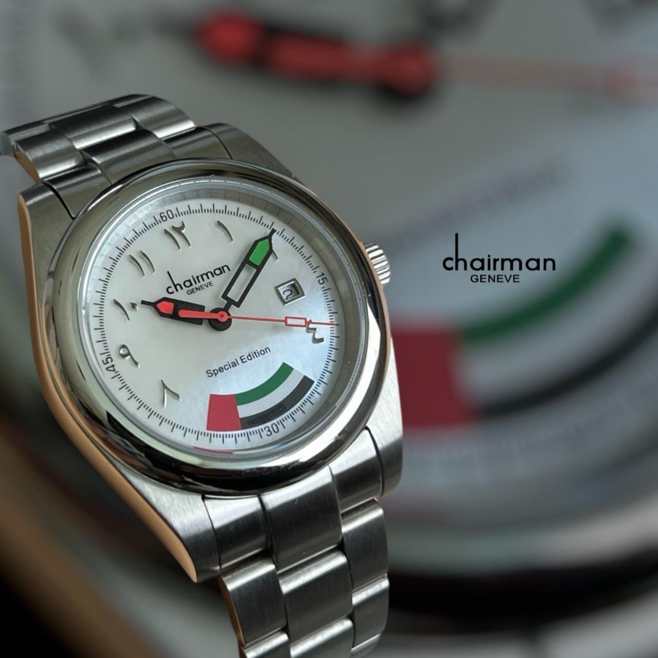 Chairman Geneve Dated Arabic UAE Flag White Dial Silver Chain Gents Watch