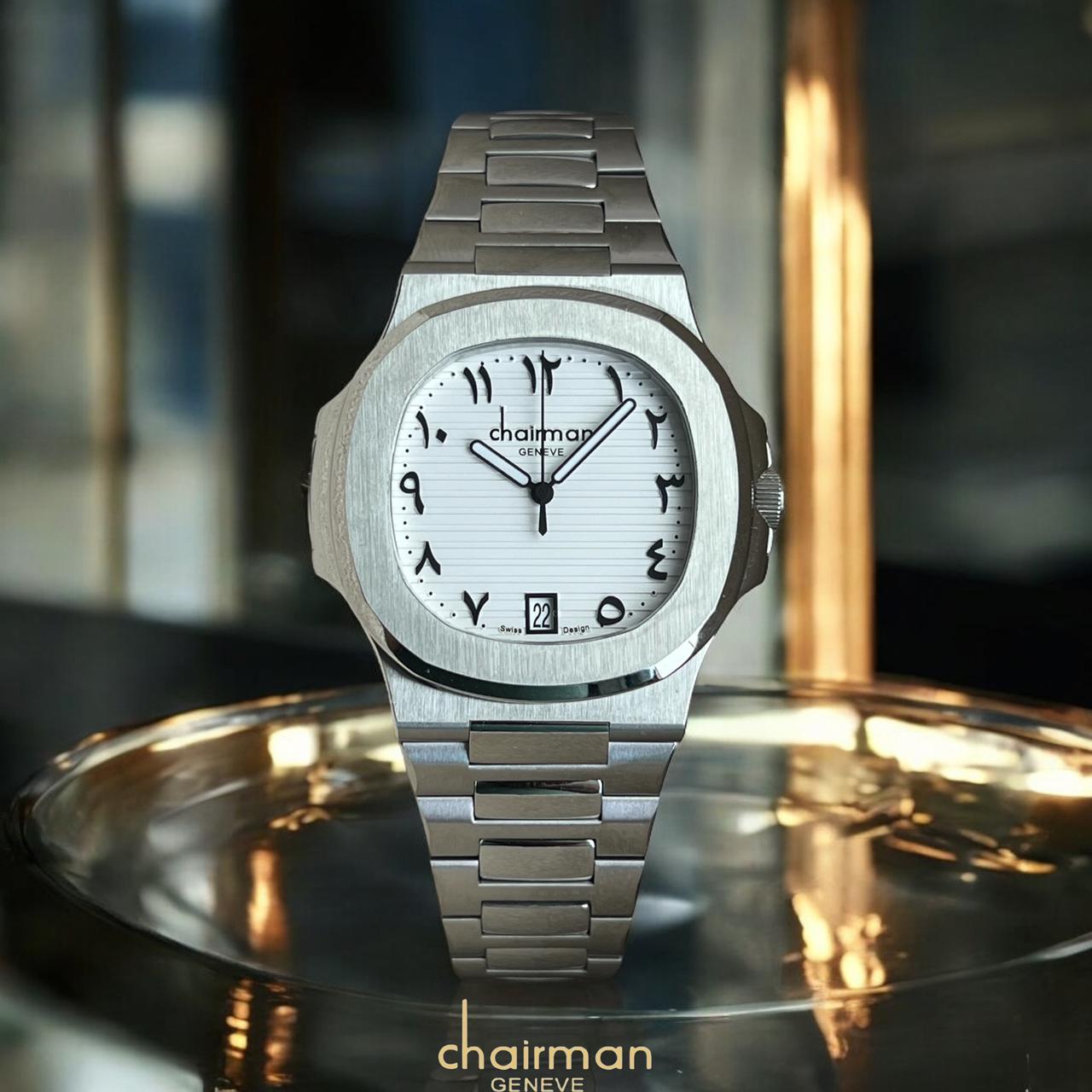 ساعة Chairman Geneve Dated Arabic للرجال بمينا بيضاء وسلسلة فضية