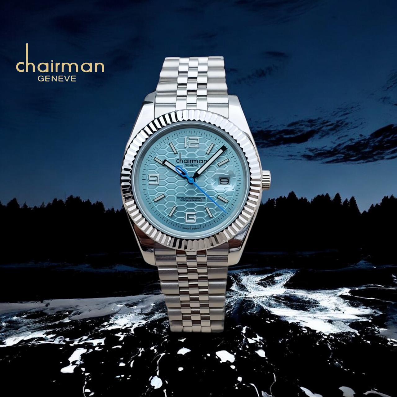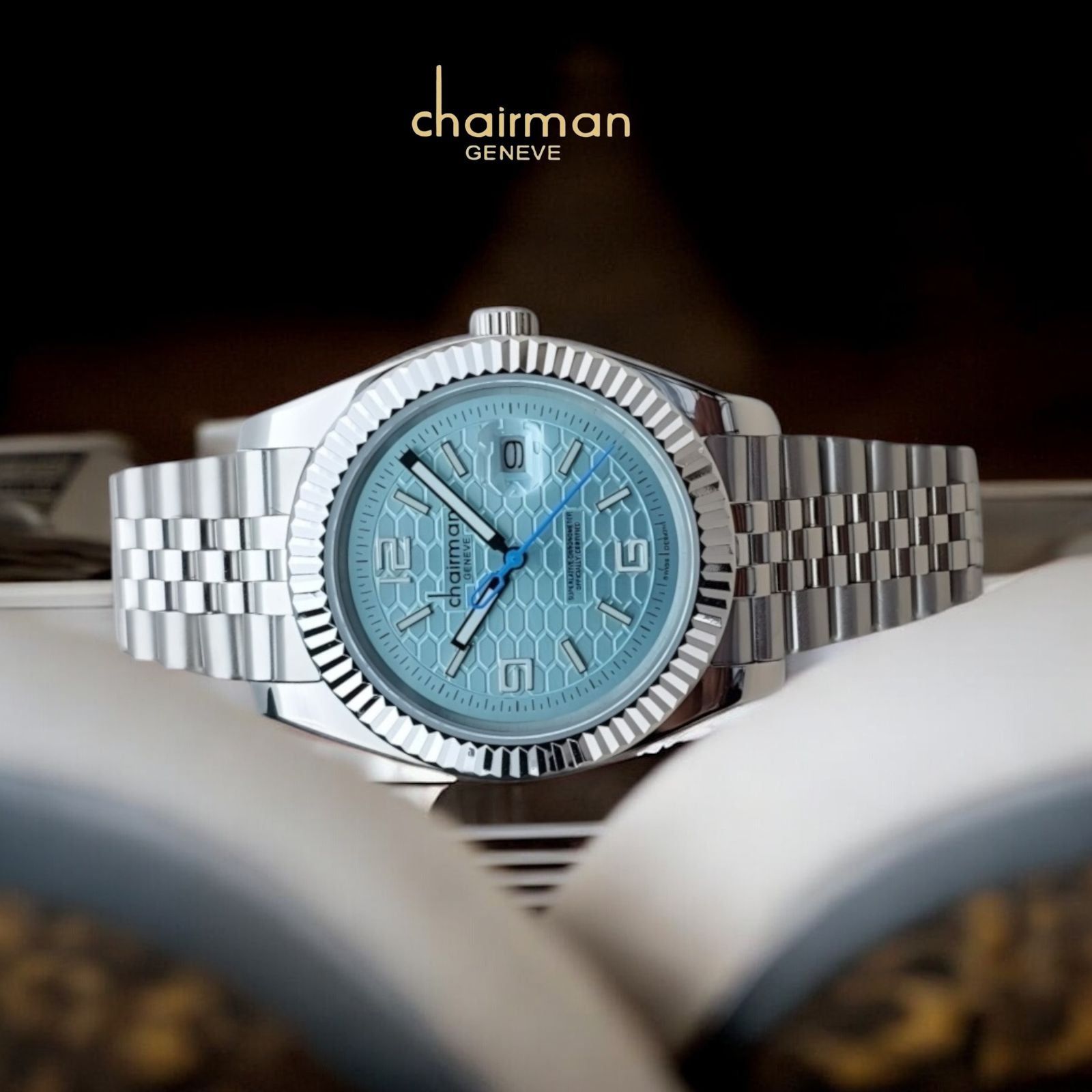 Elevate your style with the Chairman Geneve Gents Watch, featuring a striking baby blue dial and a sleek silver chain. This timeless timepiece combines classic elegance with modern design, making it perfect for any occasion. The dated dial adds practical functionality, while the durable silver chain ensures lasting comfort and sophistication. Make a confident statement with this refined accessory that complements your everyday look effortlessly.
