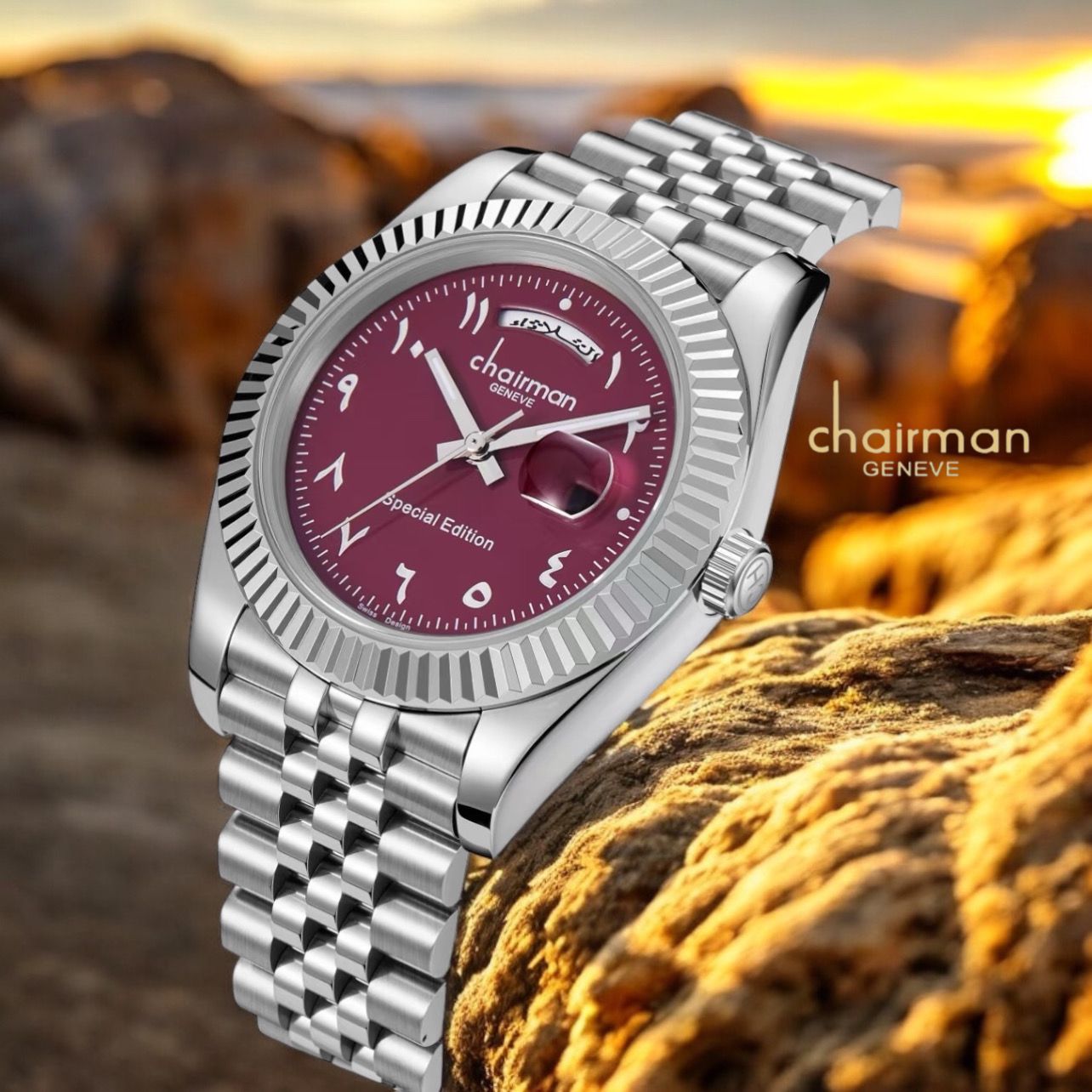 Elevate your style with the Chairman Geneve Gents Watch, featuring a rich maroon Arabic dial for a unique, sophisticated look. The day and date display keeps you effortlessly organized, while the silver chain adds a touch of timeless elegance. Designed for the modern gentleman, this watch blends functionality with refined aesthetics, perfect for any occasion.