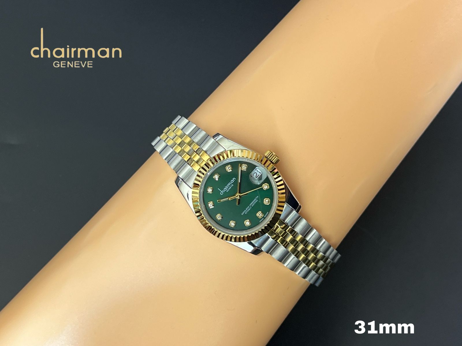 ساعة Chairman Geneve Green Stone للرجال بمينا فضية وسلسلة ذهبية