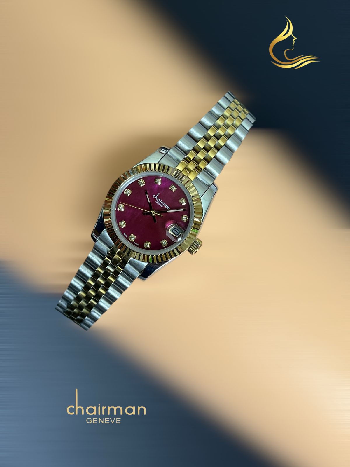 Chairman Geneve Maroon Dated Dial Silver And Gold Chain Ladies Watch