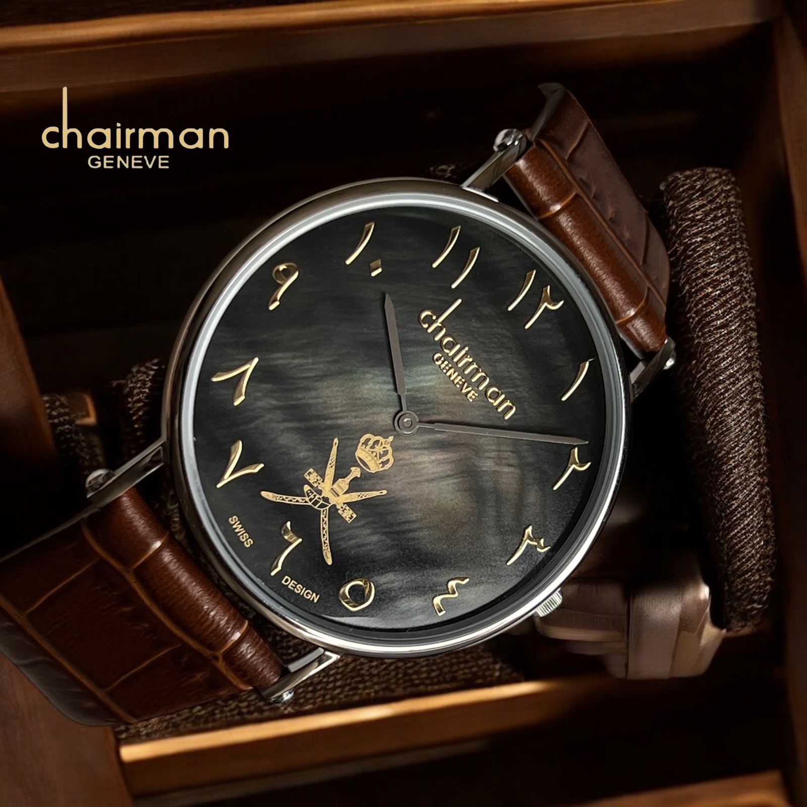 Chairman Geneve OMAN Emblem Arabic Black Dial Brown Strap Gents Watch