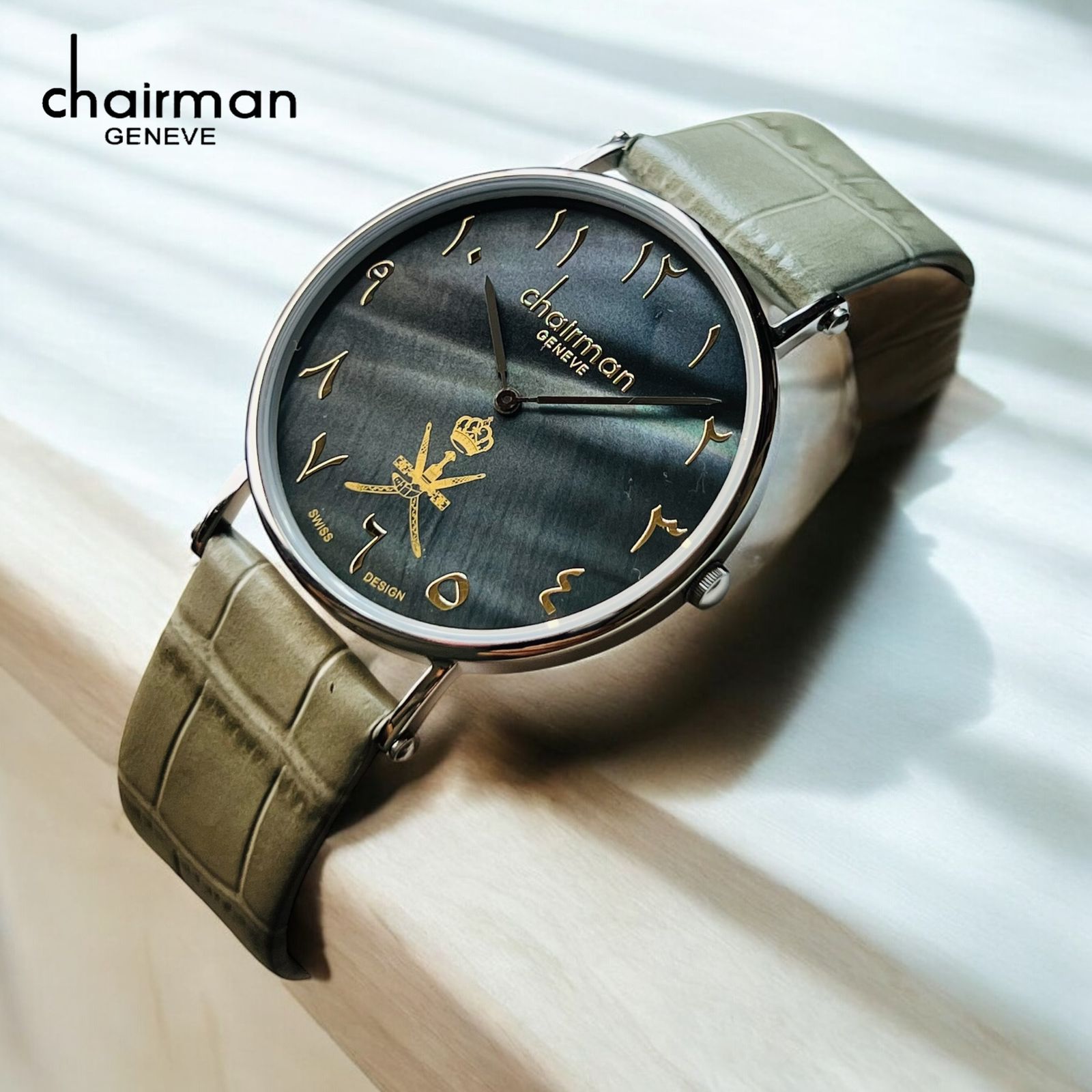 Chairman Geneve OMAN Emblem Arabic Black Dial Grey Strap Gents Watch Elevate your wrist with timeless sophistication. This distinguished timepiece features an authentic Arabic numeral dial set against a striking black background, complemented by a refined grey strap that transitions seamlessly from boardroom to casual settings. The OMAN emblem adds cultural prestige and heritage to every glance. Precision-engineered for the modern gentleman who values both style and substance, this watch makes a powerful statement about your refined taste and attention to detail.