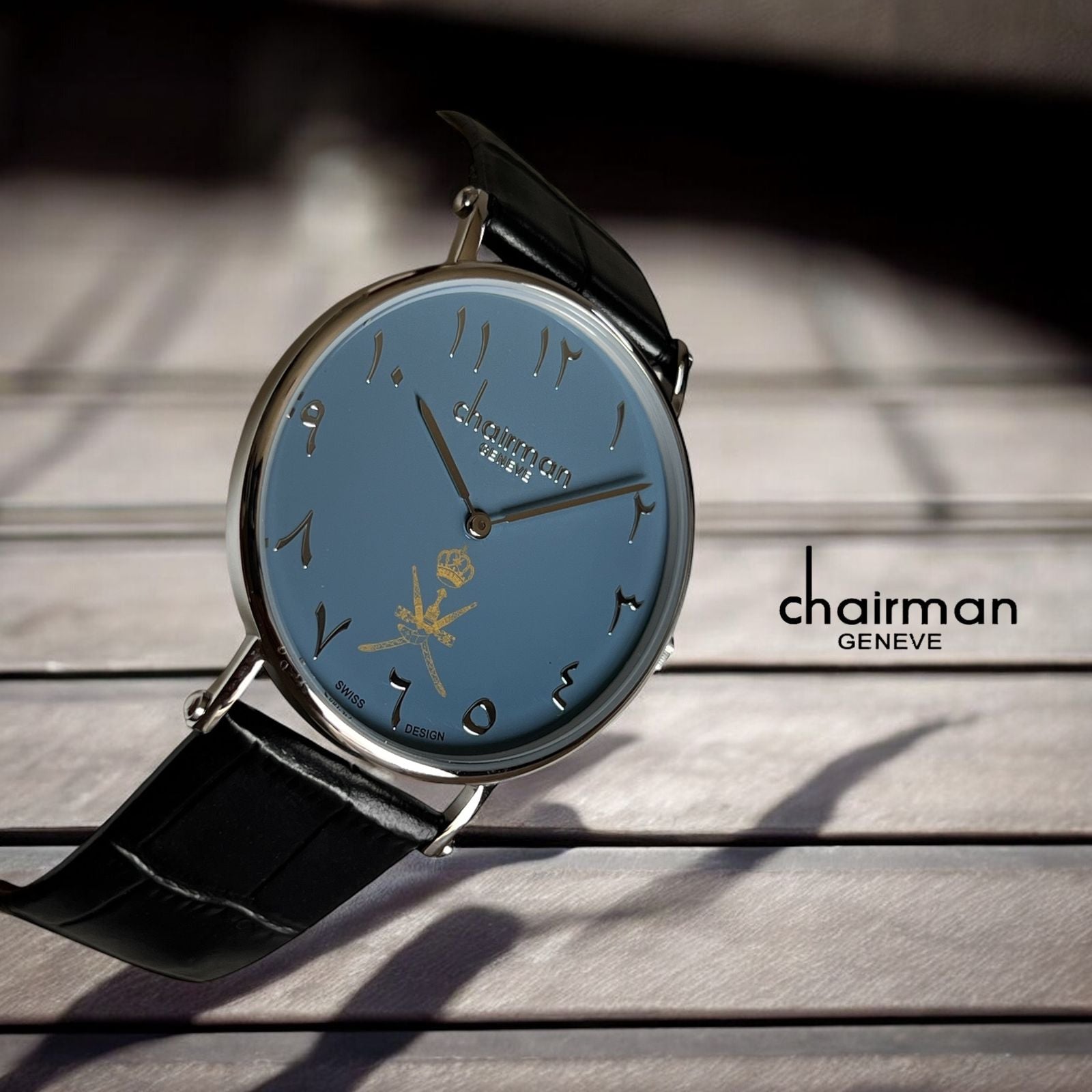 Chairman Geneve OMAN Emblem Arabic Blue Dial Black Strap Gents Watch