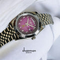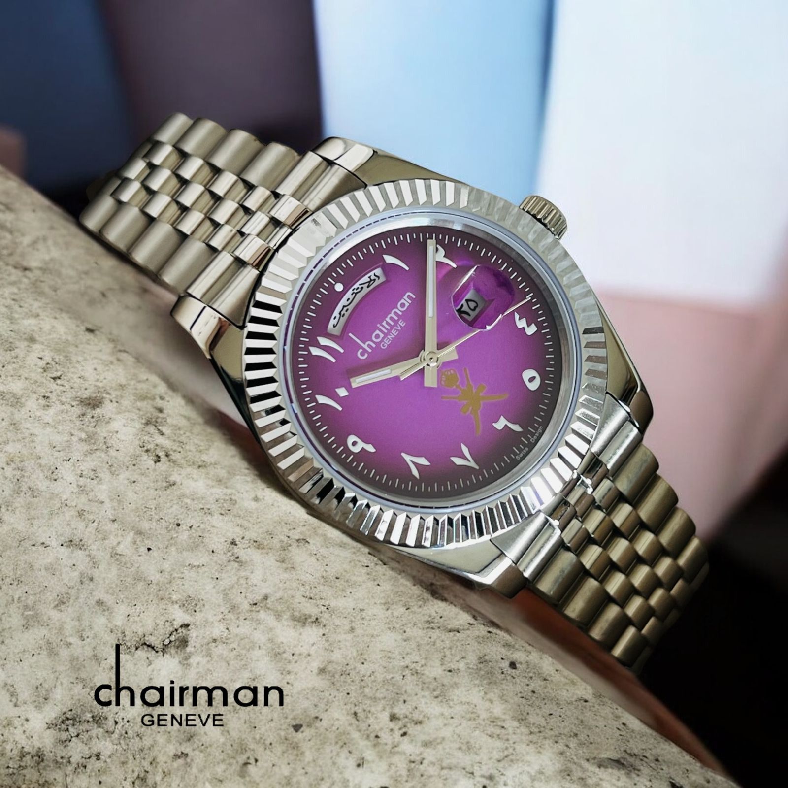 Elevate your wrist with the Chairman Geneve OMAN Emblem watch, a sophisticated timepiece that blends heritage with contemporary style. Featuring an eye-catching purple dial adorned with Arabic numerals and the iconic OMAN emblem, this gents watch makes a bold statement. The date window keeps you organized throughout your day, while the gleaming silver chain bracelet adds timeless elegance. Perfect for those who appreciate craftsmanship and cultural pride, this watch seamlessly transitions from boardroom to evening occasions.