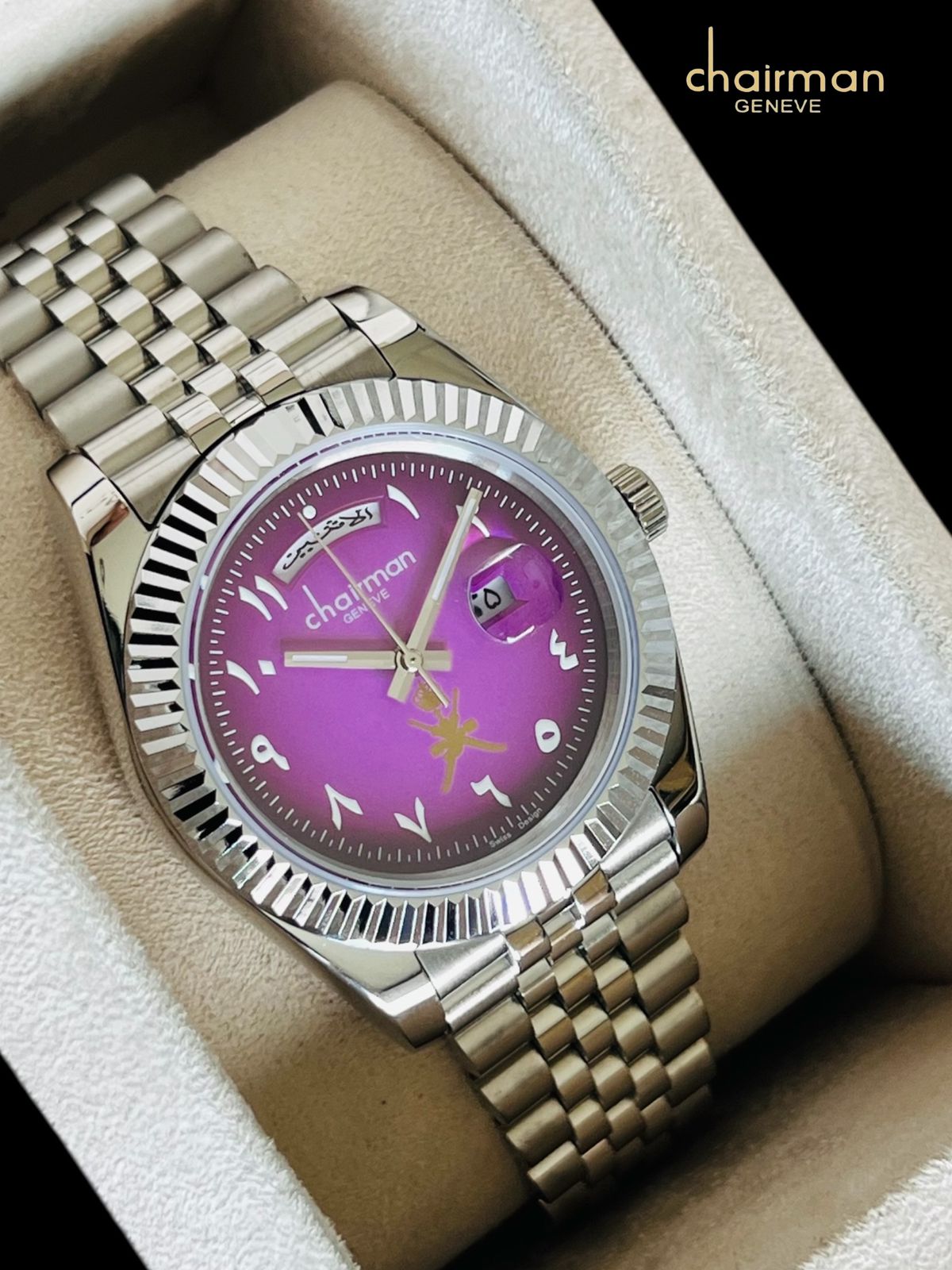 Chairman Geneve OMAN Emblem Arabic Purple Dated Dial Silver Chain Gents Watch