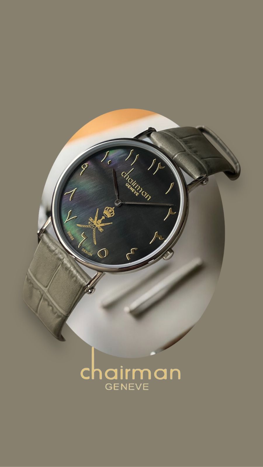 Chairman Geneve OMAN Emblem Black Arabic Dial Grey Strap Gents Watch