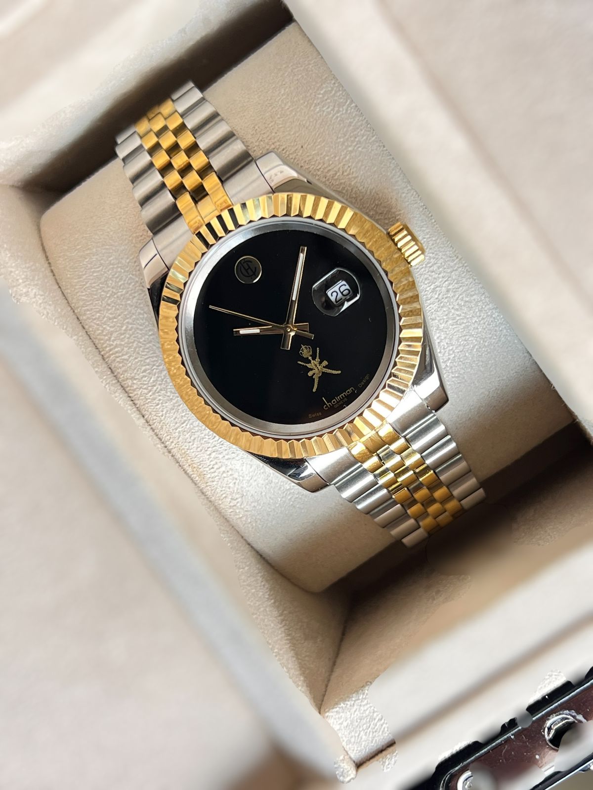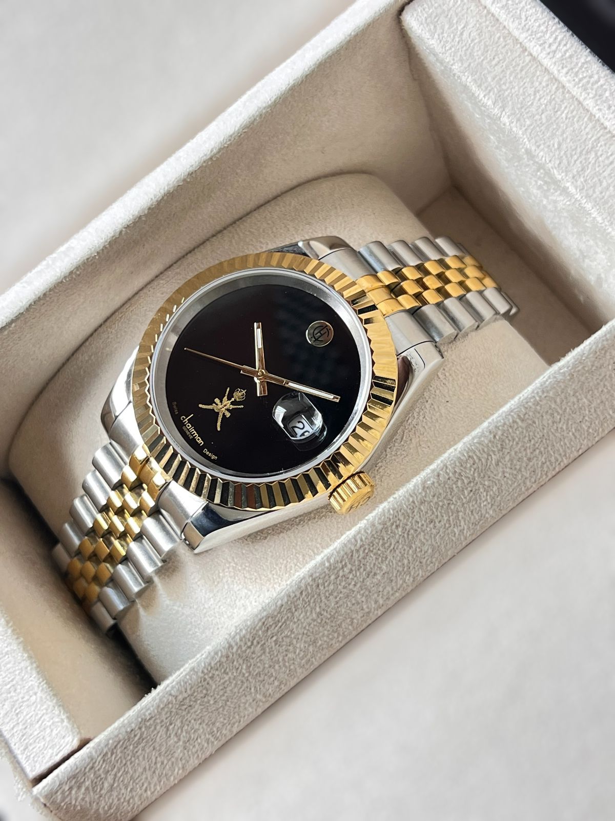 Elevate your wrist with the Chairman Geneve OMAN Emblem watch, a sophisticated timepiece that blends heritage with contemporary elegance. Featuring a striking black dial with date window functionality, this gents watch showcases a premium silver and gold chain that catches the light with every movement. The iconic OMAN emblem adds cultural significance and prestige to your collection. Crafted for the discerning gentleman who values both style and substance, this watch makes a bold statement whether in the boardroom or at social gatherings. A timeless investment piece that transcends trends.