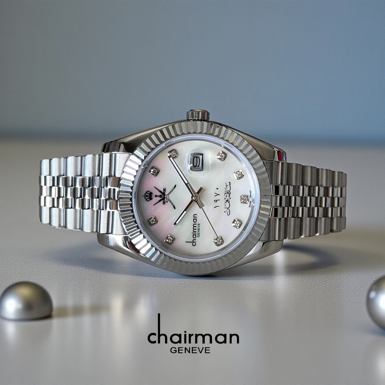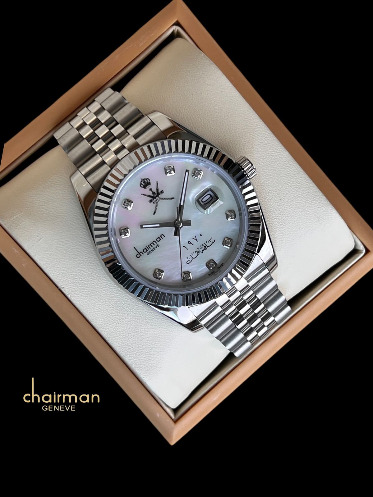 Chairman Geneve OMAN Emblem Dated Stone White Dial Silver Chain Gents Watch