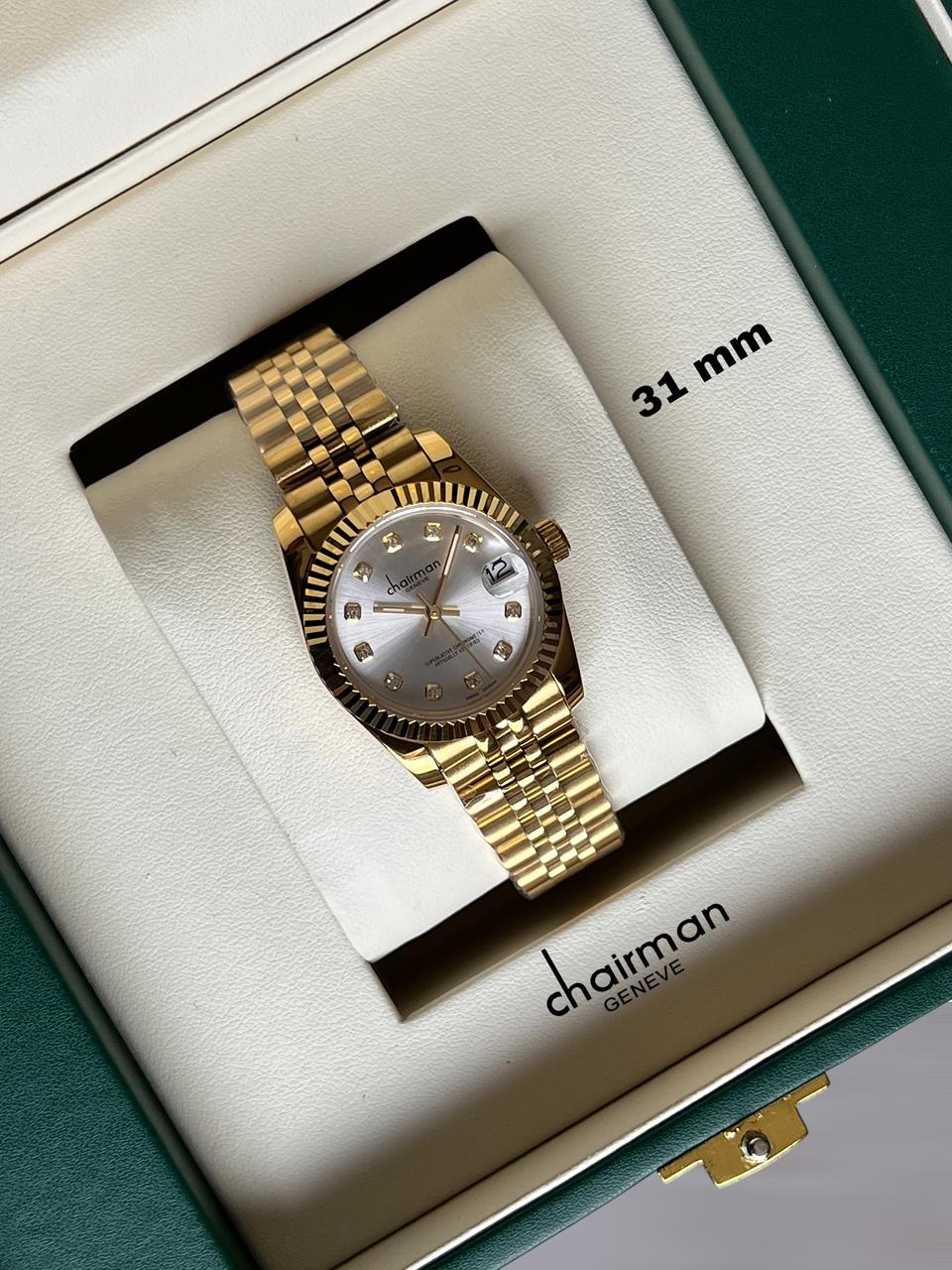 Chairman Geneve Silver Dated Stone Dial Golden Chain Ladies Watch