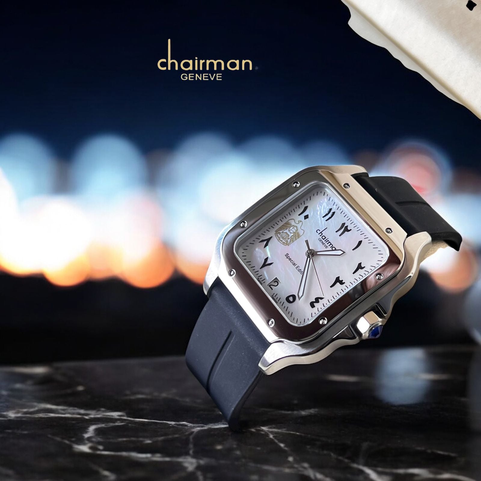 Elevate your wrist with timeless sophistication. This Chairman Geneve timepiece features a striking white dial adorned with Arabic numerals and a UAE emblem, celebrating heritage and precision. The crisp date window keeps you organized, while the navy blue strap adds a touch of refined elegance. Crafted for the modern gentleman who values quality and distinctive style, this watch seamlessly transitions from boardroom to evening occasions. A statement piece that speaks volumes about your taste.