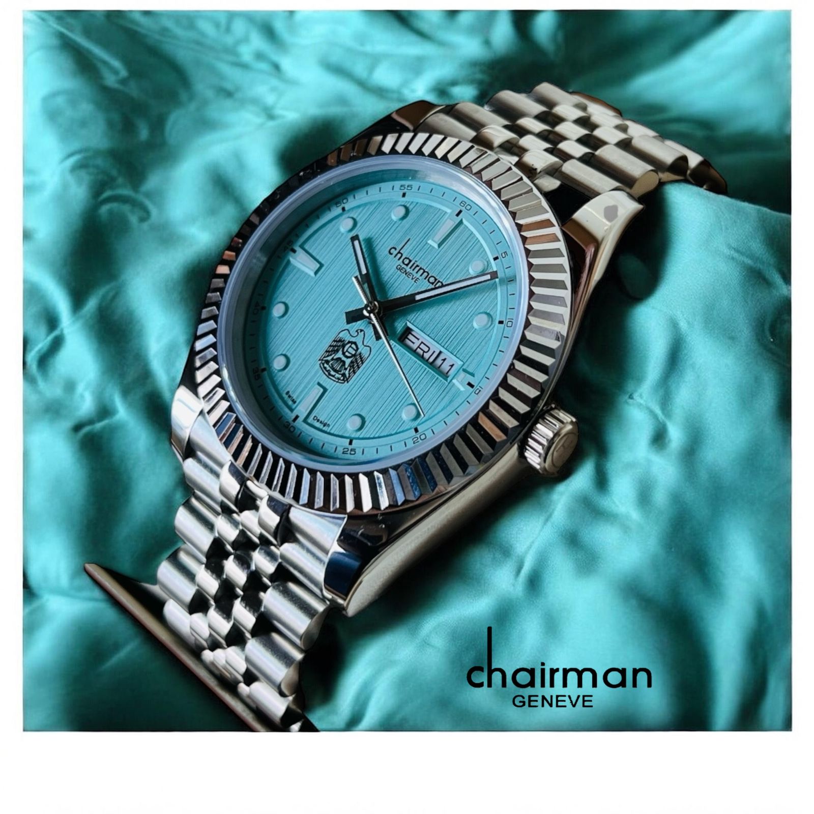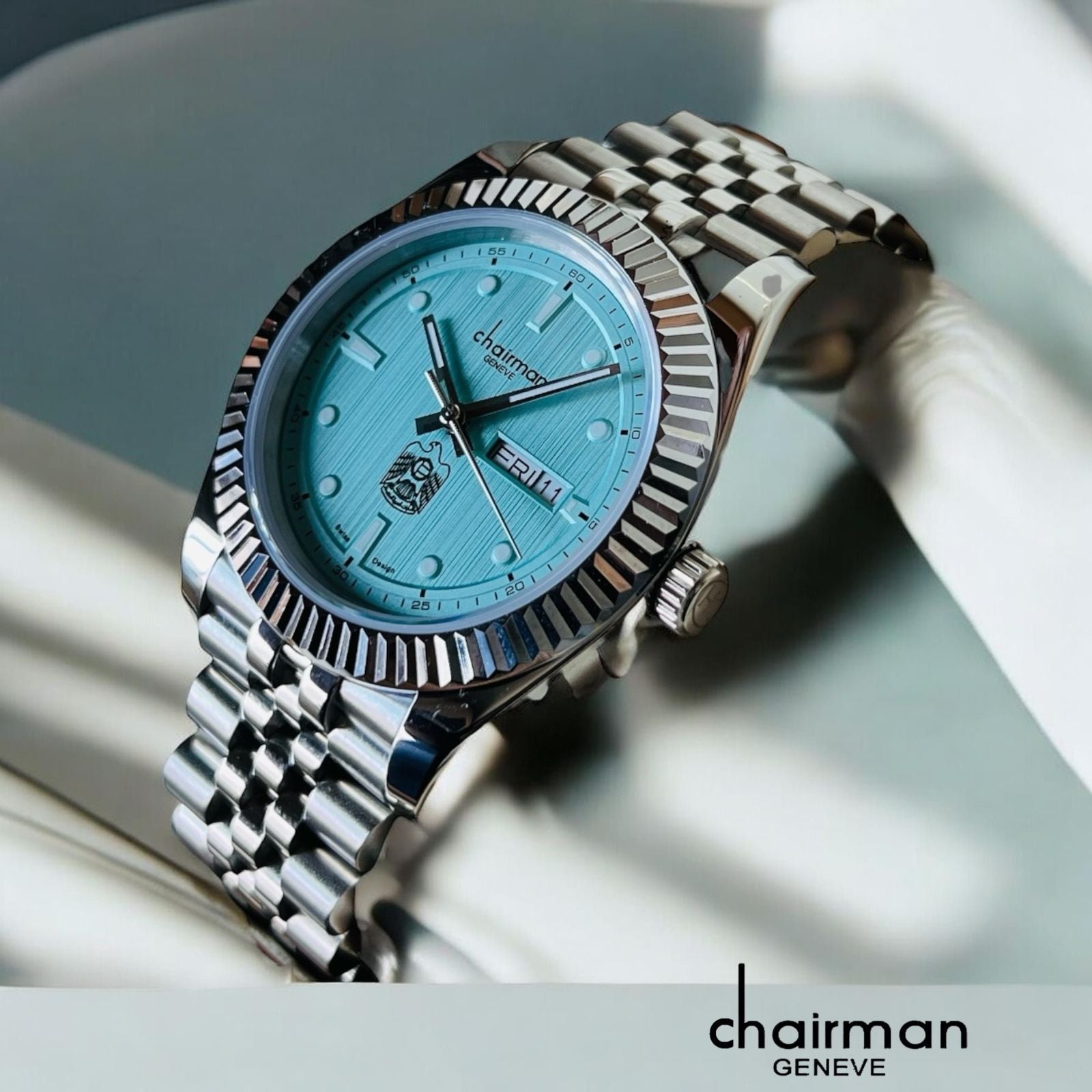 Chairman Geneve UAE Emblem Day And Dated Baby Blue Dial Silver Chain Gents Watch