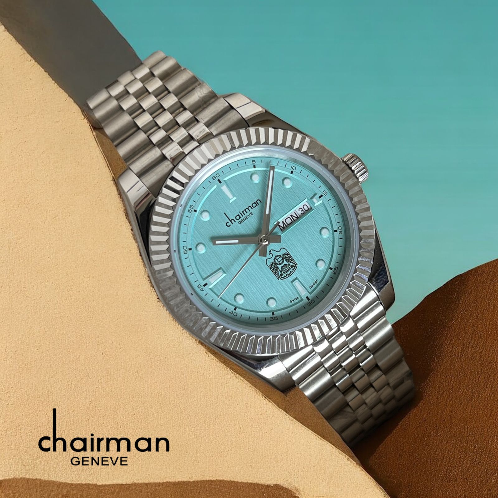 Elevate your style with the Chairman Geneve Gents Watch, featuring a striking sky blue dial accented by the UAE emblem. This sophisticated timepiece combines day and date functions with a sleek silver chain, offering both elegance and practicality. Perfect for the modern gentleman, it adds a refined touch to any outfit while celebrating national pride.